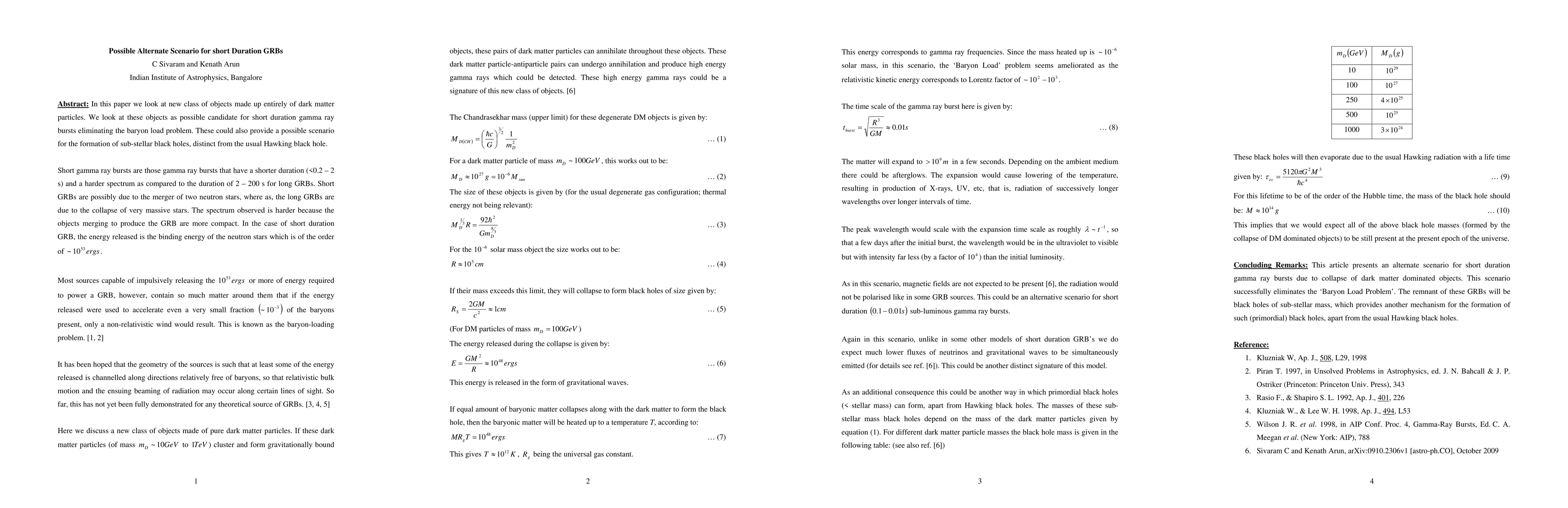 In this paper we look at new class of objects made up entirely of dark matter particles. We look at these objects as possible candidate for short duration gamma ray bursts eliminating the baryon load problem. These could also provide a possible scenario for the formation of sub-stellar black holes, distinct from the usual Hawking black hole.