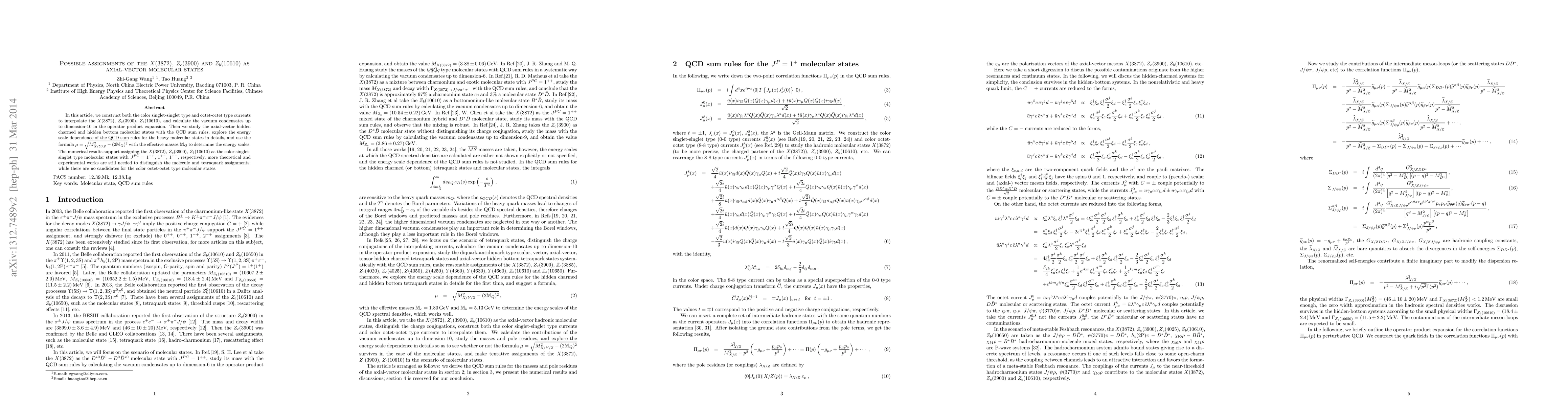 In this article, we construct both the color singlet-singlet type and octet-octet type currents to interpolate the $X(3872)$, $Z_c(3900)$, $Z_b(10610)$, and calculate the vacuum condensates up to dimension-10 in the operator product expansion. Then we study the axial-vector hidden charmed and hidden bottom molecular states with the QCD sum rules, explore the energy scale dependence of the QCD sum rules for the heavy molecular states in details, and use the formula $\mu=\sqrt{M^2_{X/Y/Z}-(2{\mathbb{M}}_Q)^2}$ with the effective masses ${\mathbb{M}}_Q$ to determine the energy scales. The numerical results support assigning the $X(3872)$, $Z_c(3900)$, $Z_b(10610)$ as the color singlet-singlet type molecular states with $J^{PC}=1^{++}$, $1^{+-}$, $1^{+-}$, respectively, more theoretical and experimental works are still needed to distinguish the molecule and tetraquark assignments; while there are no candidates for the color octet-octet type molecular states.