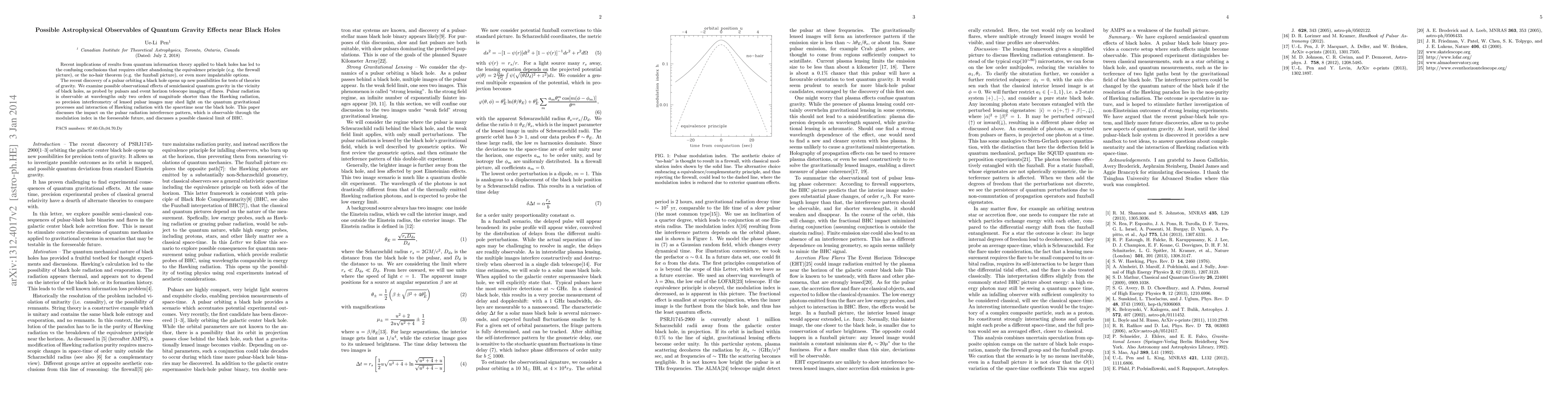 This paper explores the potential observational effects of semiclassical quantum gravity near black holes, using pulsars and imaging techniques. It investigates how precision interferometry of lensed pulsar images might reveal quantum gravitational interactions, focusing on the modulation index of pulsar radiation as a possible observable.