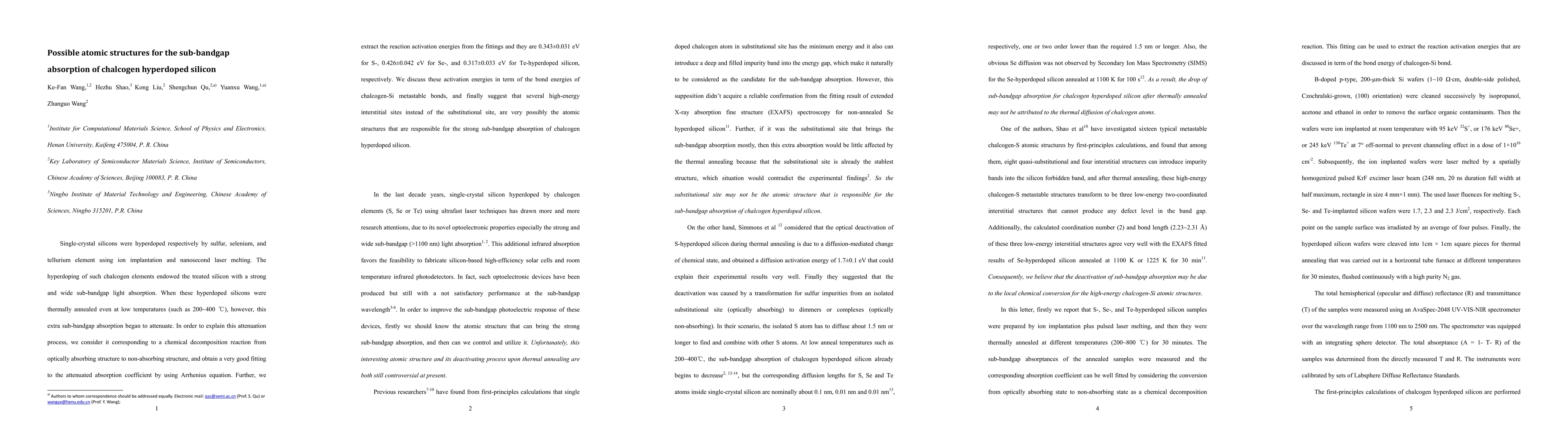 Single-crystal silicon wafers were hyperdoped respectively by sulfur, selenium, and tellurium element using ion implantation and nanosecond laser melting. The hyperdoping of such chalcogen elements endowed the treated silicon with a strong and wide sub-bandgap light absorptance. When these hyperdoped silicons were thermally annealed even at low temperatures (such as 200~400 oC), however, this extra sub-bandgap absorptance began to attenuate. In order to explain this attenuation of absorptance, alternatively, we consider it corresponding to a chemical decomposition reaction from optically absorbing structure to non-absorbing structure, and obtain a very good fitting to the attenuated absorptances by using Arrhenius equation. Further, we extract the reaction activation energies from the fittings and they are 0.343(+/- 0.031) eV for S-, 0.426(+/-0.042) eV for Se-, and 0.317(+/-0.033) eV for Te-hyperdoped silicon, respectively. We discuss these activation energies in term of the bond energies of chalcogen-Si metastable bonds, and finally suggest that several high-energy interstitial sites instead of the substitutional site, are very possibly the atomic structures that are responsible for the sub-bandgap absorptance of chalcogen hyperdoped silicon.