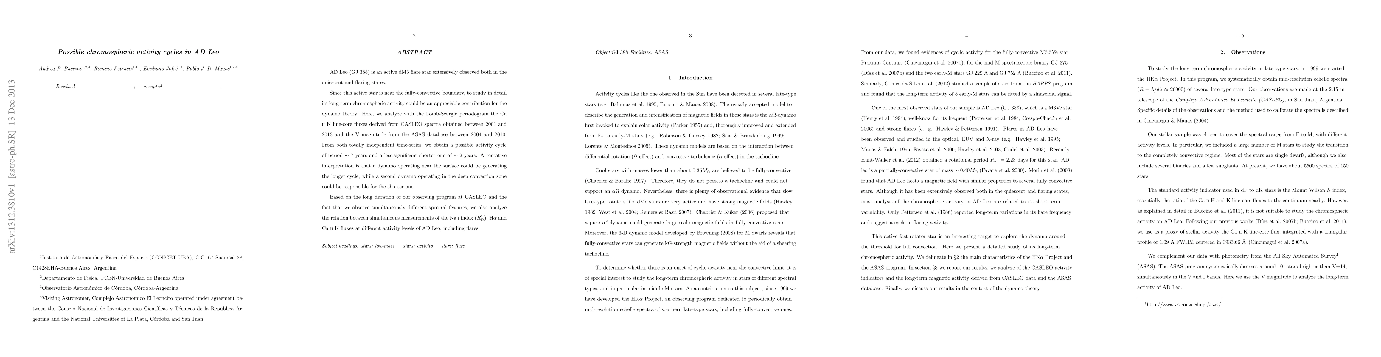 AD Leo (GJ 388) is an active dM3 flare star extensively observed both in the quiescent and flaring states. Since this active star is near the fully-convective boundary, to study in detail its long-term chromospheric activity could be an appreciable contribution for the dynamo theory. Here, we analyze with the Lomb-Scargle periodogram the Ca II K line-core fluxes derived from CASLEO spectra obtained between 2001 and 2013 and the V magnitude from the ASAS database between 2004 and 2010. From both totally independent time-series, we obtain a possible activity cycle of period $\sim7$ years and a less-significant shorter one of $\sim2$ years. A tentative interpretation is that a dynamo operating near the surface could be generating the longer cycle, while a second dynamo operating in the deep convection zone could be responsible for the shorter one. Based on the long duration of our observing program at CASLEO and the fact that we observe simultaneously different spectral features, we also analyze the relation between simultaneous measurements of the Na I index ($R^{\prime}_D$), H$\alpha$ and Ca II K fluxes at different activity levels of AD Leo, including flares.