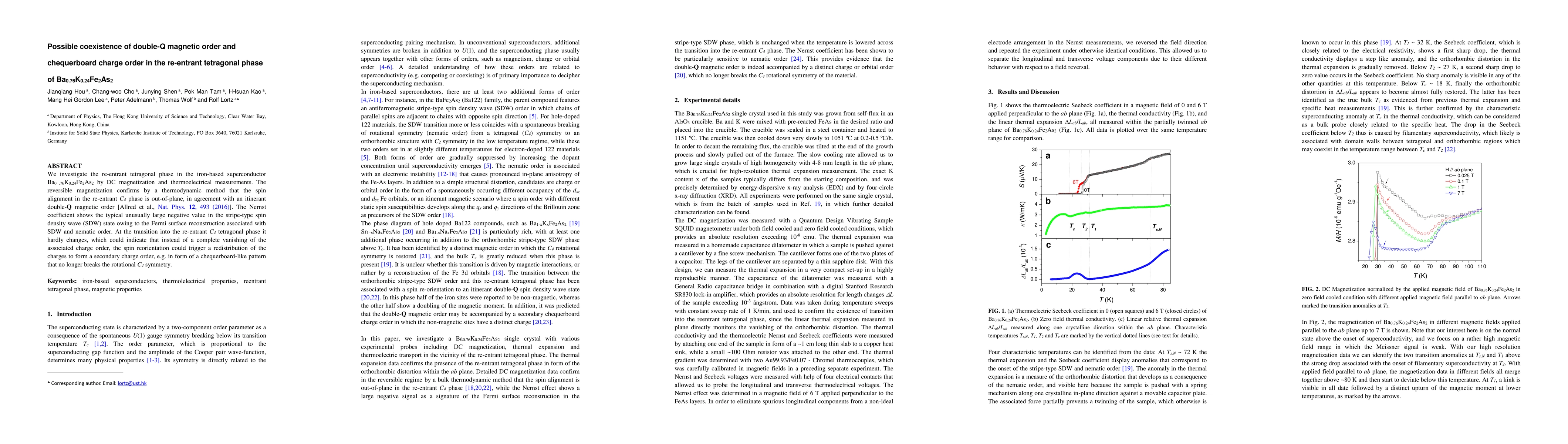 This study reveals the coexistence of double-Q magnetic order and chequerboard charge order in the re-entrant tetragonal phase of Ba0.76K0.24Fe2As2, as evidenced by DC magnetization and thermoelectrical measurements. The findings suggest that spin reorientation may redistribute charges into a new chequerboard pattern without breaking the C4 symmetry.