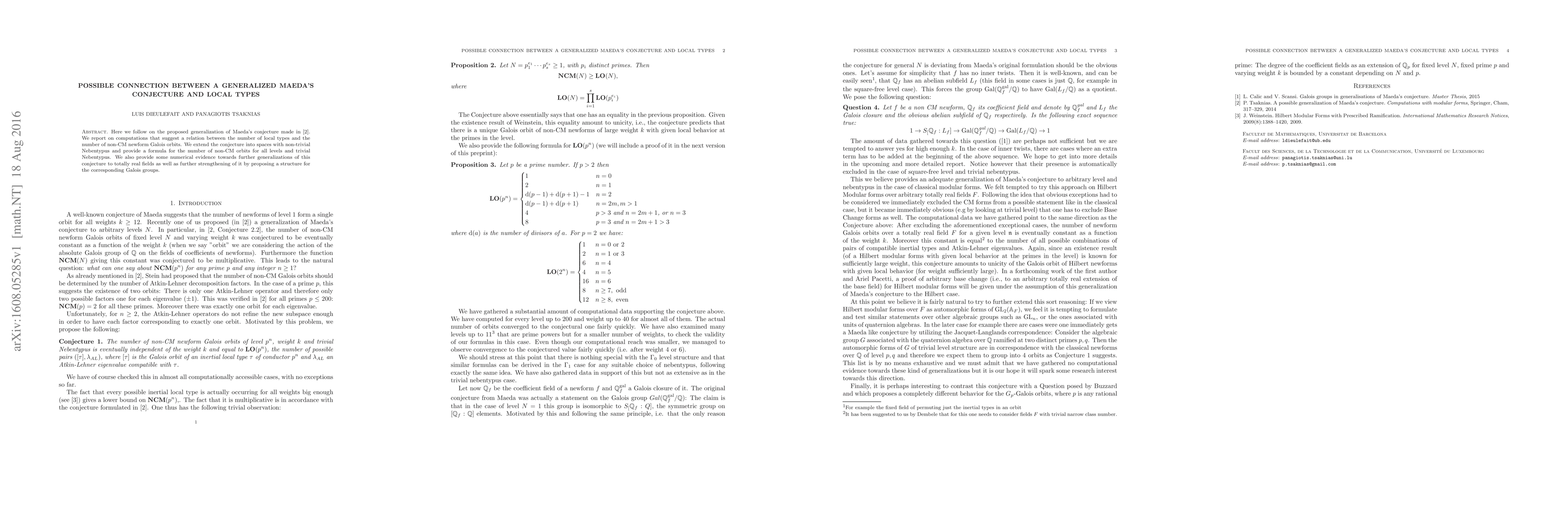 Here we follow on the proposed generalization of Maeda's conjecture made in [2]. We report on computations that suggest a relation between the number of local types and the number of non-CM newform Galois orbits. We extend the conjecture into spaces with non-trivial Nebentypus and provide a formula for the number of non-CM orbits for all levels and trivial Nebentypus. We also provide some numerical evidence towards further generalizations of this conjecture to totally real fields as well as further strengthening of it by proposing a structure for the corresponding Galois groups.