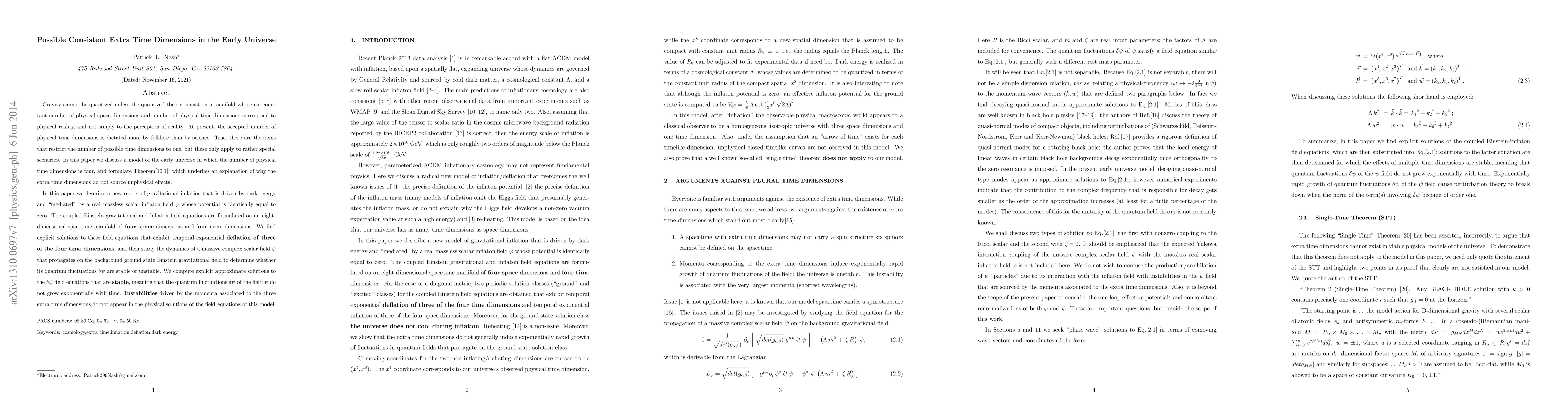Gravity cannot be quantized unless the quantized theory is cast on a manifold whose concomitant number of physical space dimensions and number of physical time dimensions correspond to physical reality, and not simply to the perception of reality. At present, the accepted number of physical time dimensions is dictated more by folklore than by science. In this paper we discuss a model of the early universe in which the number of physical time dimensions is four, and formulate Theorem[\ref{tj}], which underlies an explanation of why the extra time dimensions do not source unphysical effects. In this paper we describe a new model of gravitational inflation that is driven by dark energy and "mediated" by a real massless scalar inflaton field $\varphi$ whose potential is identically equal to zero. The coupled Einstein gravitational and inflaton field equations are formulated on an eight-dimensional spacetime manifold of \textbf{four space} dimensions and \textbf{four time} dimensions. We find explicit solutions to these field equations that exhibit temporal exponential \textbf{deflation of three of the four time dimensions}, and then study the dynamics of a massive complex scalar field $\psi$ that propagates on the background ground state Einstein gravitational field to determine whether its quantum fluctuations $\delta \psi$ are stable or unstable. We compute explicit approximate solutions to the $\delta \psi$ field equations that are \textbf{stable}, meaning that the quantum fluctuations $\delta \psi$ of the field $\psi$ do not grow exponentially with time. \textbf{Instabilities} driven by the momenta associated to the three extra time dimensions do not appear in the physical solutions of the field equations of this model.