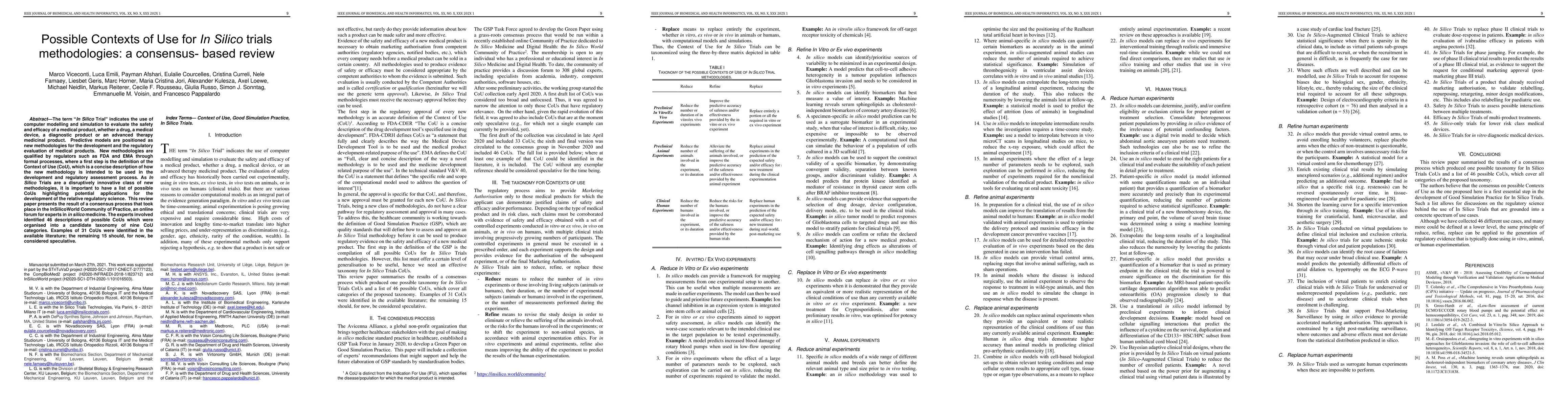 The term "In Silico Trial" indicates the use of computer modelling and simulation to evaluate the safety and efficacy of a medical product, whether a drug, a medical device, a diagnostic product or an advanced therapy medicinal product. Predictive models are positioned as new methodologies for the development and the regulatory evaluation of medical products. New methodologies are qualified by regulators such as FDA and EMA through formal processes, where a first step is the definition of the Context of Use (CoU), which is a concise description of how the new methodology is intended to be used in the development and regulatory assessment process. As In Silico Trials are a disruptively innovative class of new methodologies, it is important to have a list of possible CoUs highlighting potential applications for the development of the relative regulatory science. This review paper presents the result of a consensus process that took place in the InSilicoWorld Community of Practice, an online forum for experts in in silico medicine. The experts involved identified 46 descriptions of possible CoUs which were organised into a candidate taxonomy of nine CoU categories. Examples of 31 CoUs were identified in the available literature; the remaining 15 should, for now, be considered speculative.