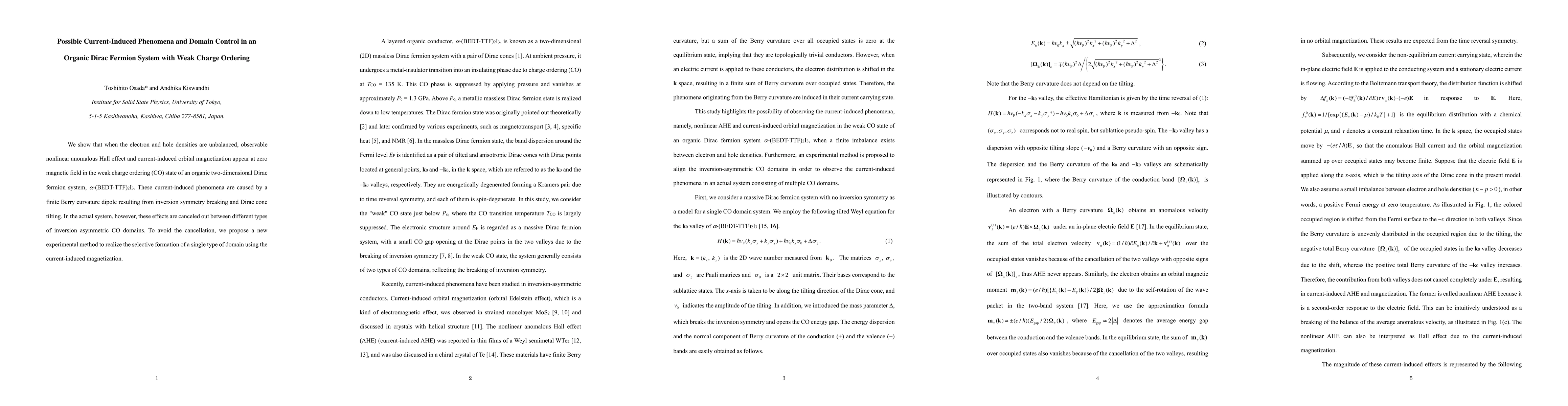 This paper investigates current-induced phenomena in an organic Dirac fermion system with weak charge ordering, revealing a nonlinear anomalous Hall effect and current-induced orbital magnetization due to inversion symmetry breaking. A proposed method aims to selectively form a single type of domain to avoid effect cancellation.