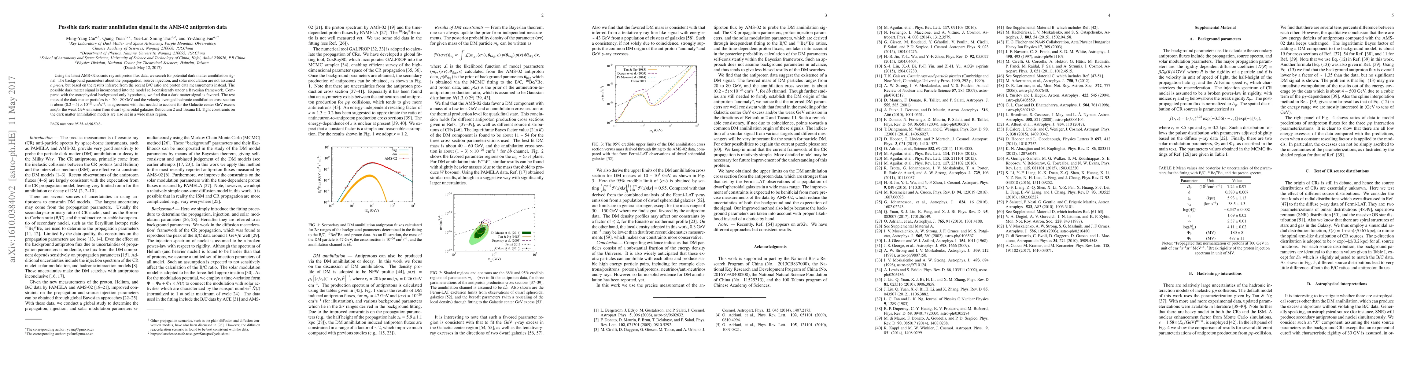 This paper analyzes the latest AMS-02 antiproton flux data to search for a potential dark matter annihilation signal, finding a favored dark matter signal with a rest mass of $\sim 20-80$ GeV and an annihilation cross section of $(0.2-5)\times 10^{-26}$ cm$^{3}$s$^{-1}$. These results align with explanations for the Galactic center GeV excess and emissions from dwarf galaxies.