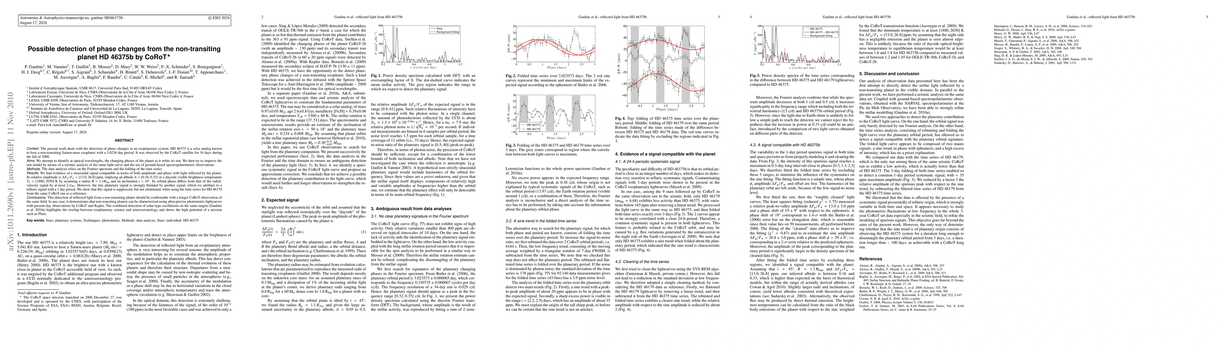 The present work deals with the detection of phase changes in an exoplanetary system. HD 46375 is a solar analog known to host a non-transiting Saturn-mass exoplanet with a 3.0236 day period. It was observed by the CoRoT satellite for 34 days during the fall of 2008. We attempt to identify at optical wavelengths, the changing phases of the planet as it orbits its star. We then try to improve the star model by means of a seismic analysis of the same light curve and the use of ground-based spectropolarimetric observations. The data analysis relies on the Fourier spectrum and the folding of the time series. We find evidence of a sinusoidal signal compatible in terms of both amplitude and phase with light reflected by the planet. Its relative amplitude is Delta Fp/F* = [13.0, 26.8] ppm, implying an albedo A=[0.16, 0.33] or a dayside visible brightness temperature Tb ~ [1880,2030] K by assuming a radius R=1.1 R_Jup and an inclination i=45 deg. Its orbital phase differs from that of the radial-velocity signal by at most 2 sigma_RV. However, the tiny planetary signal is strongly blended by another signal, which we attribute to a telluric signal with a 1 day period. We show that this signal is suppressed, but not eliminated, when using the time series for HD 46179 from the same CoRoT run as a reference. This detection of reflected light from a non-transiting planet should be confirmable with a longer CoRoT observation of the same field. In any case, it demonstrates that non-transiting planets can be characterized using ultra-precise photometric lightcurves with present-day observations by CoRoT and Kepler. The combined detection of solar-type oscillations on the same targets (Gaulme et al. 2010a) highlights the overlap between exoplanetary science and asteroseismology and shows the high potential of a mission such as Plato.