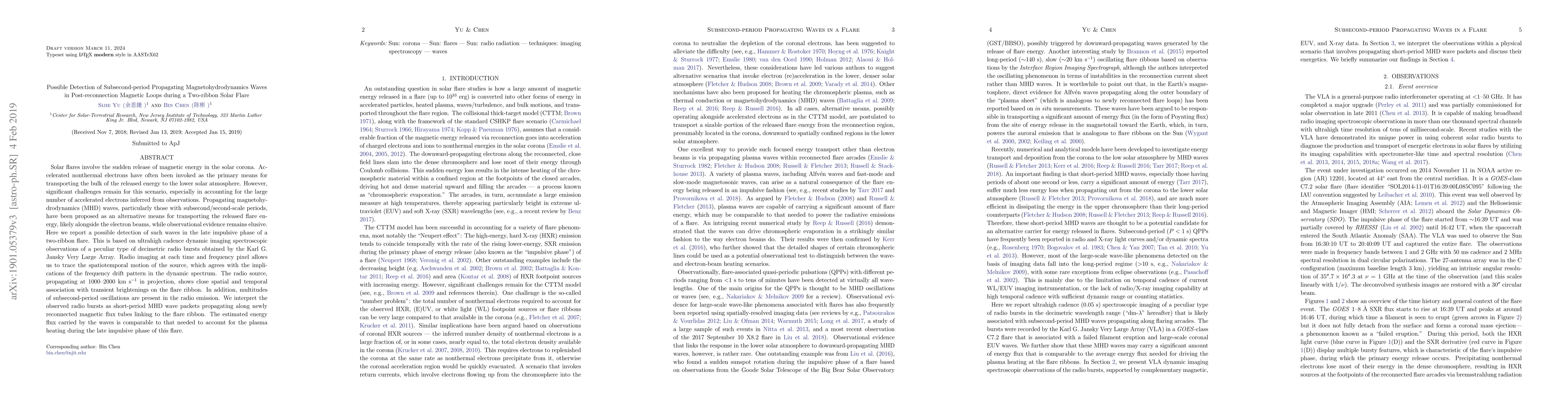Solar flares involve the sudden release of magnetic energy in the solar corona. Accelerated nonthermal electrons have often been invoked as the primary means for transporting the bulk of the released energy to the lower solar atmosphere. However, significant challenges remain for this scenario, especially in accounting for the large number of accelerated electrons inferred from observations. Propagating magnetohydrodynamics (MHD) waves, particularly those with subsecond/second-scale periods, have been proposed as an alternative means for transporting the released flare energy, likely alongside the electron beams, while observational evidence remains elusive. Here we report a possible detection of such waves in the late impulsive phase of a two-ribbon flare. This is based on ultrahigh cadence dynamic imaging spectroscopic observations of a peculiar type of decimetric radio bursts obtained by the Karl G. Jansky Very Large Array. Radio imaging at each time and frequency pixel allows us to trace the spatiotemporal motion of the source, which agrees with the implications of the frequency drift pattern in the dynamic spectrum. The radio source, propagating at 1000--2000 km s$^{-1}$ in projection, shows close spatial and temporal association with transient brightenings on the flare ribbon. In addition, multitudes of subsecond-period oscillations are present in the radio emission. We interpret the observed radio bursts as short-period MHD wave packets propagating along newly reconnected magnetic flux tubes linking to the flare ribbon. The estimated energy flux carried by the waves is comparable to that needed to account for the plasma heating during the late impulsive phase of this flare.