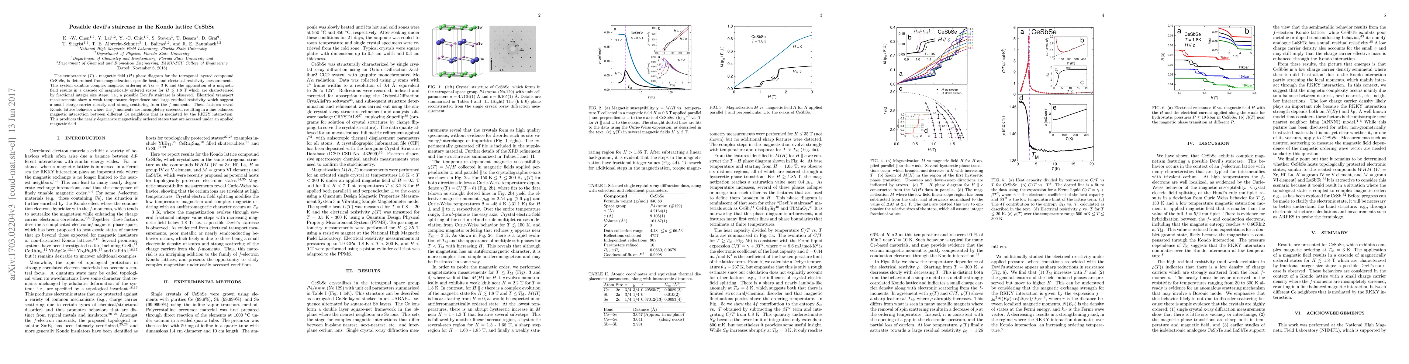 The CeSbSe compound exhibits a complex magnetic phase diagram with a cascade of magnetically ordered states under low magnetic fields, suggesting a possible Devil's staircase. The system shows Kondo lattice behavior with incomplete screening of $f$-moments, leading to fine-tuned magnetic interactions and nearly degenerate ordered states.