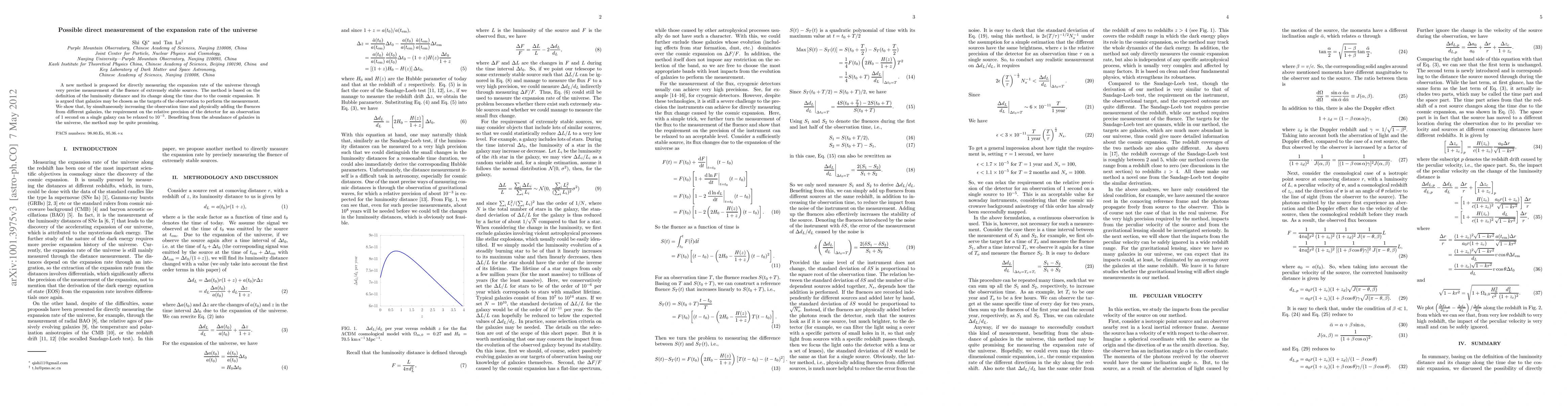 A new method is proposed for directly measuring the expansion rate of the universe through very precise measurement of the fluence of extremely stable sources. The method is based on the definition of the luminosity distance and its change along the time due to the cosmic expansion. It is argued that galaxies may be chosen as the targets of the observation to perform the measurement. We show that, by simultaneously increasing the observation time and physically adding the fluences from different galaxies, the requirement on the relative precision of the detector for an observation of 1 second on a single galaxy can be relaxed to $10^{-5}$. Benefiting from the abundance of galaxies in the universe, the method may be quite promising.