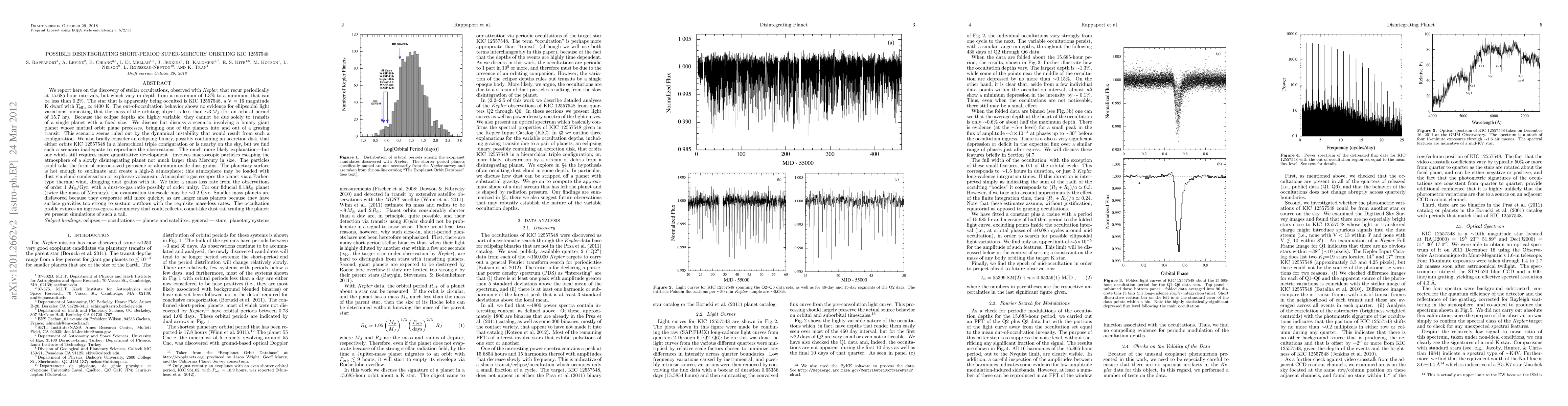 The paper reports the discovery of a short-period super-Mercury orbiting KIC 12557548, exhibiting highly variable stellar occultations suggesting a disintegrating planet. The planet's atmosphere is losing mass, likely due to a Parker-type thermal wind, with dust grains forming a tail that contributes to the variable eclipse depths.