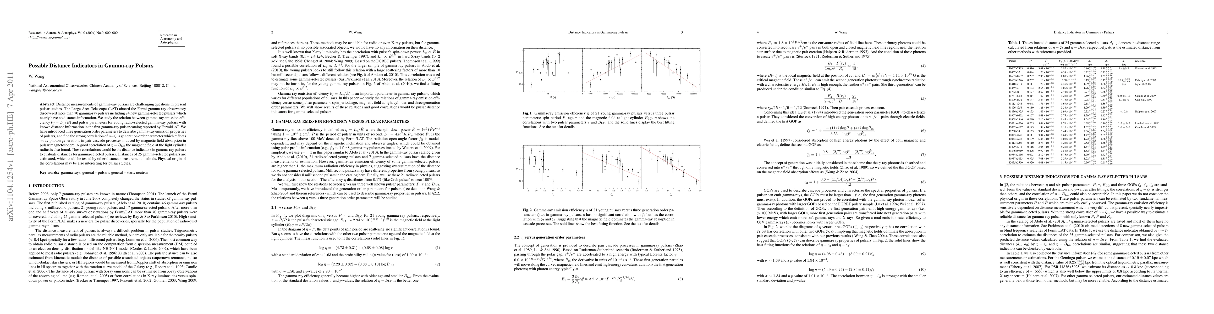 This paper investigates potential distance indicators for gamma-ray pulsars using correlations between gamma-ray emission efficiency and pulsar parameters. The study identifies strong correlations between emission efficiency and generation order parameters, as well as the magnetic field at the light cylinder radius, which may serve as distance indicators for gamma-selected pulsars.