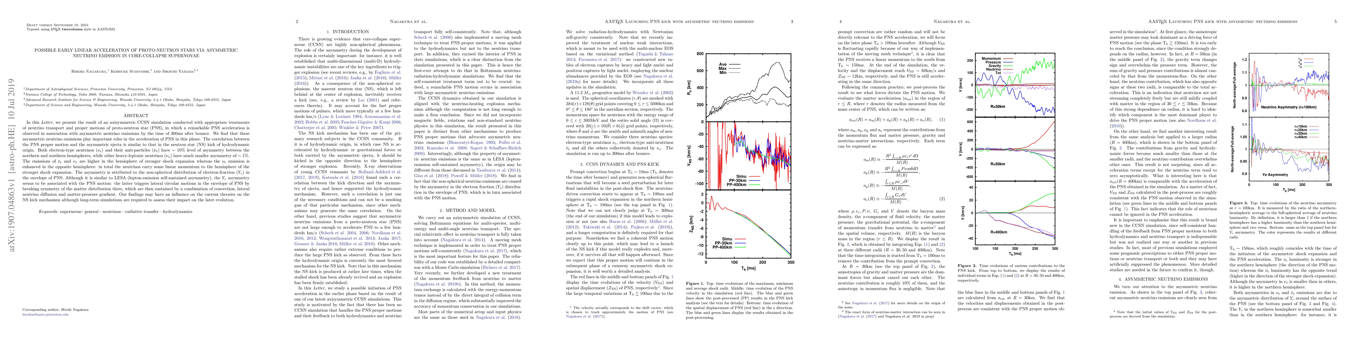 This paper reports on a simulation showing that asymmetric neutrino emissions in core-collapse supernovae can lead to early linear acceleration of proto-neutron stars (PNS) within 300ms post-bounce. The study finds that electron-type neutrinos exhibit a significant asymmetry, contributing to PNS acceleration and resembling the neutron star kick mechanism.