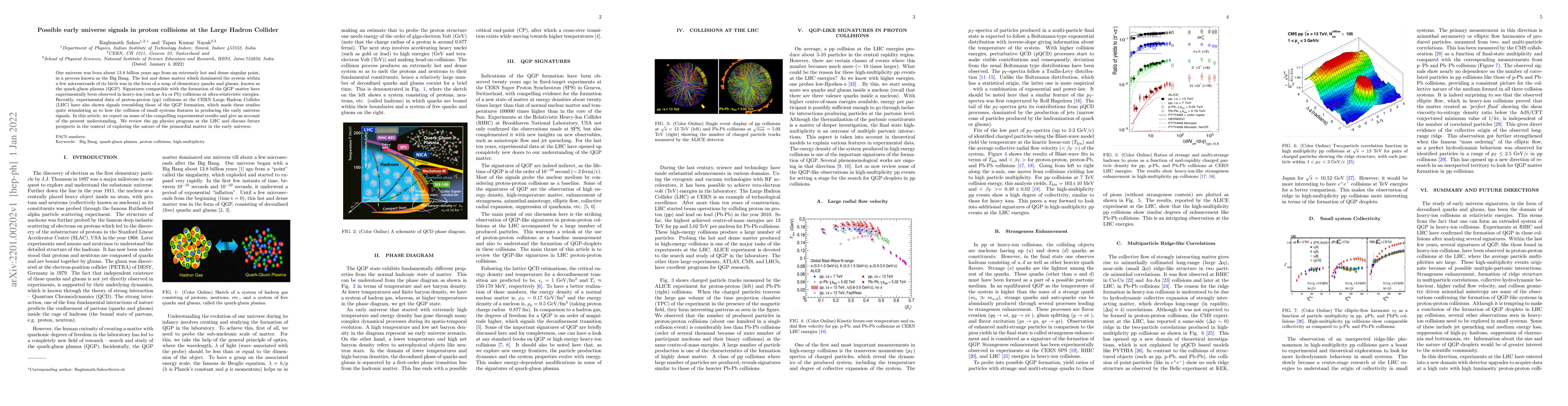 This paper investigates signals from proton collisions at the Large Hadron Collider (LHC) that may indicate the formation of quark-gluon plasma, a state of matter similar to that in the early universe. The study reviews experimental results and discusses the potential of LHC's proton-proton collisions to provide insights into the primordial matter of the early universe.