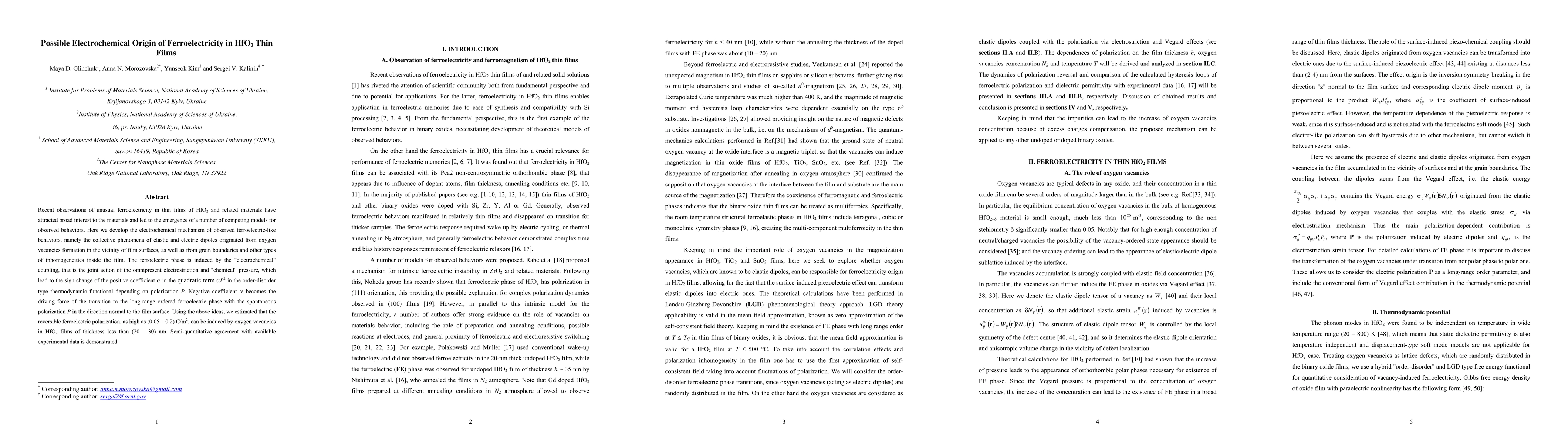 This paper proposes an electrochemical mechanism for the observed ferroelectricity in HfO_2 thin films, attributing it to oxygen vacancies and inhomogeneities that induce a transition to a ferroelectric phase through electrostriction and chemical pressure. The model predicts reversible ferroelectric polarization up to 0.2 C/m^2 in films under 30 nm thick, aligning with experimental observations.