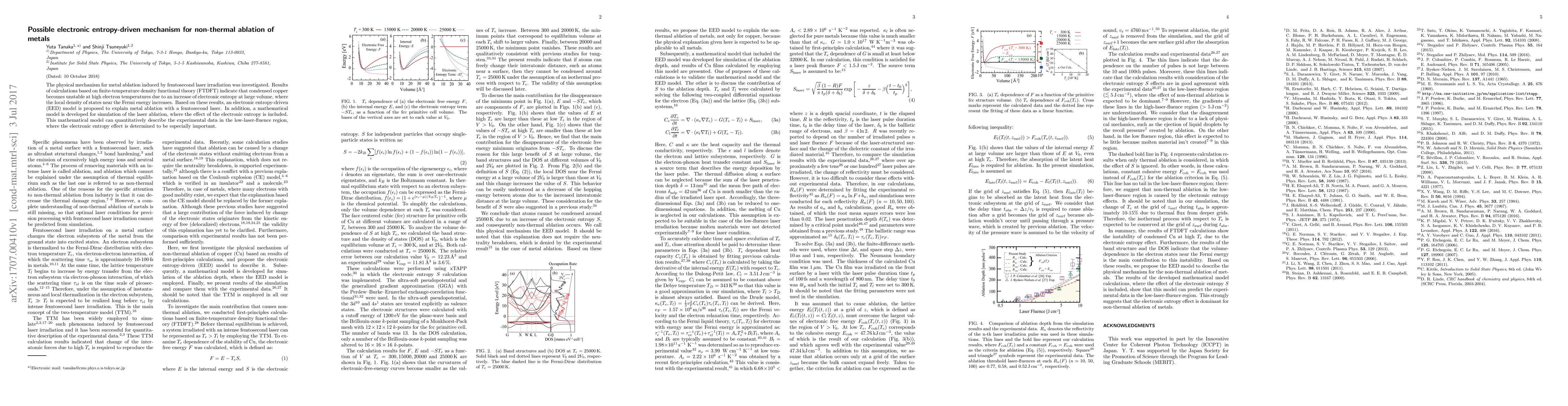 This paper proposes an electronic entropy-driven (EED) mechanism for non-thermal metal ablation using femtosecond laser irradiation, based on calculations showing that high electron temperatures destabilize condensed copper due to increased electronic entropy at larger volumes. A mathematical model incorporating this effect accurately simulates experimental data in low-laser-fluence conditions.