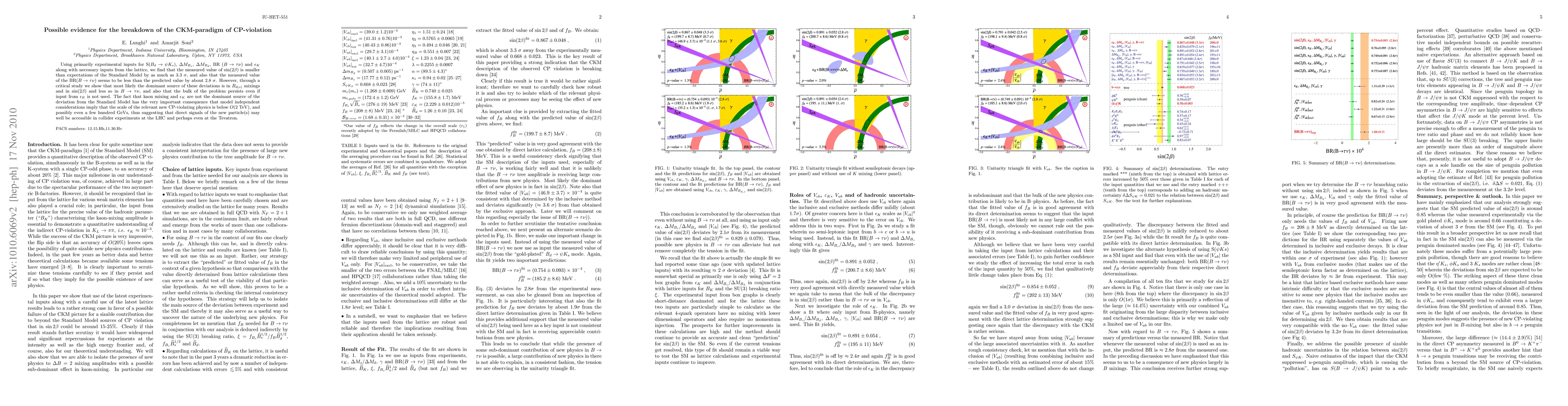 Using primarily experimental inputs for S(B -> psi Ks), Delta M_Bs, Delta M_Bd, BR(B -> tau nu) and epsilon_K along with necessary inputs from the lattice, we find that the measured value of sin(2 beta) is smaller than expectations of the Standard Model by as much as 3.3 sigma, and also that the measured value of the BR(B -> tau nu) seems to be less than the predicted value by about 2.8 sigma. However, through a critical study we show that most likely the dominant source of these deviations is in B_d(s) mixings and in sin(2 beta) and less so in B -> tau nu, and also that the bulk of the problem persists even if input from epsilon_K is not used. The fact that kaon mixing and epsilon_K are not the dominant source of the deviation from the Standard Model has the very important consequence that model independent considerations imply that the scale of the relevant new CP-violating physics is below O(2 TeV), thus suggesting that direct signals of the new particle(s) may well be accessible in collider experiments at the LHC and perhaps even at the Tevatron.