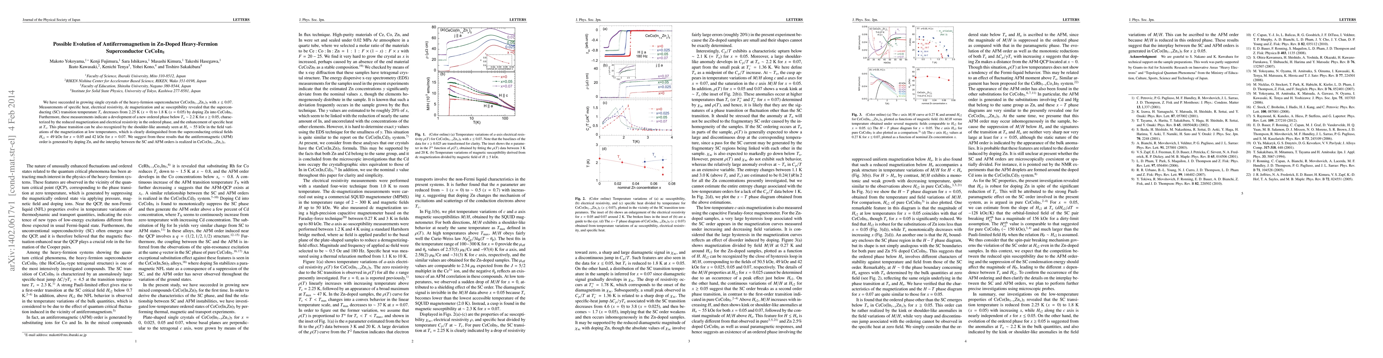 The paper reports successful growth of single crystals of CeCo(In1-xZnx)5 with x<=0.07, revealing that Zn doping decreases superconducting temperature Tc. A new ordered phase emerges below T_o ~ 2.2 K for x=>0.05, characterized by reduced magnetization and resistivity, and enhanced specific heat. This phase transition is linked to antiferromagnetic order generation by Zn doping, suggesting an interplay between superconductivity and antiferromagnetism in CeCo(In1-xZnx)5.