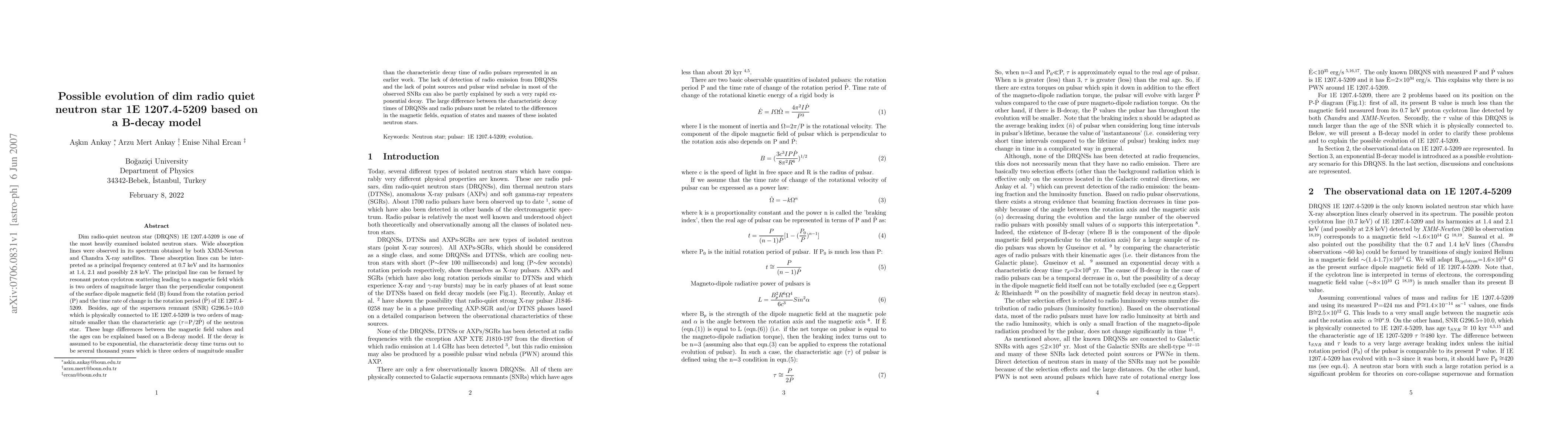 This paper explores the evolution of the dim radio-quiet neutron star 1E 1207.4-5209, proposing a B-decay model to explain its unique magnetic field and age discrepancies. The model suggests an exponential decay with a much shorter timescale than radio pulsars, potentially explaining the lack of radio emissions and associated phenomena.