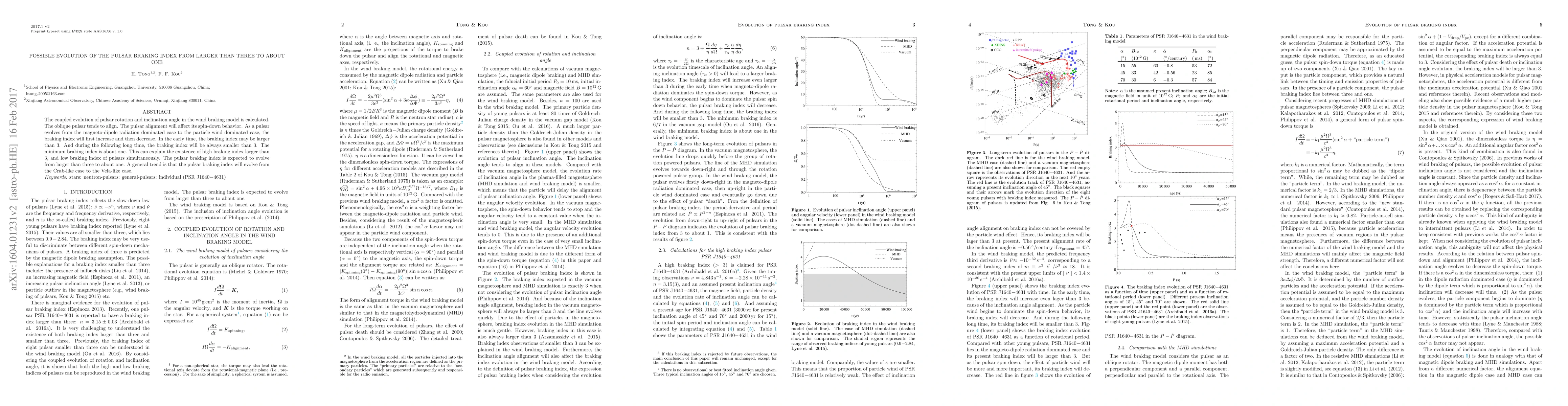 This paper explores how pulsar braking index can evolve from greater than three to around one through the transition from magneto-dipole to particle wind dominated braking, explaining the coexistence of high and low braking indices. The study suggests a general trend from Crab-like to Vela-like pulsar behavior.