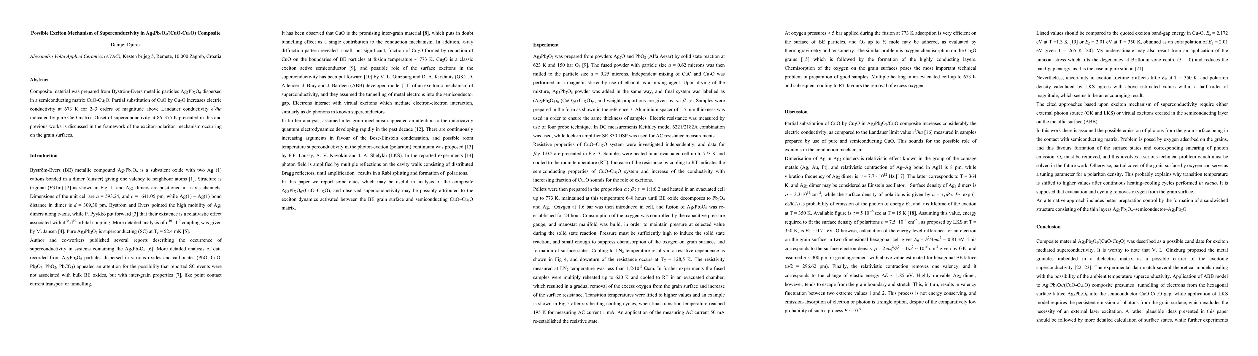 This research investigates a composite material of Ag5Pb2O6 particles in a CuO-Cu2O matrix, showing a significant increase in electric conductivity and the onset of superconductivity at high temperatures, attributed to an exciton-polariton mechanism on grain surfaces. The findings suggest a novel exciton-based mechanism for superconductivity in this composite.