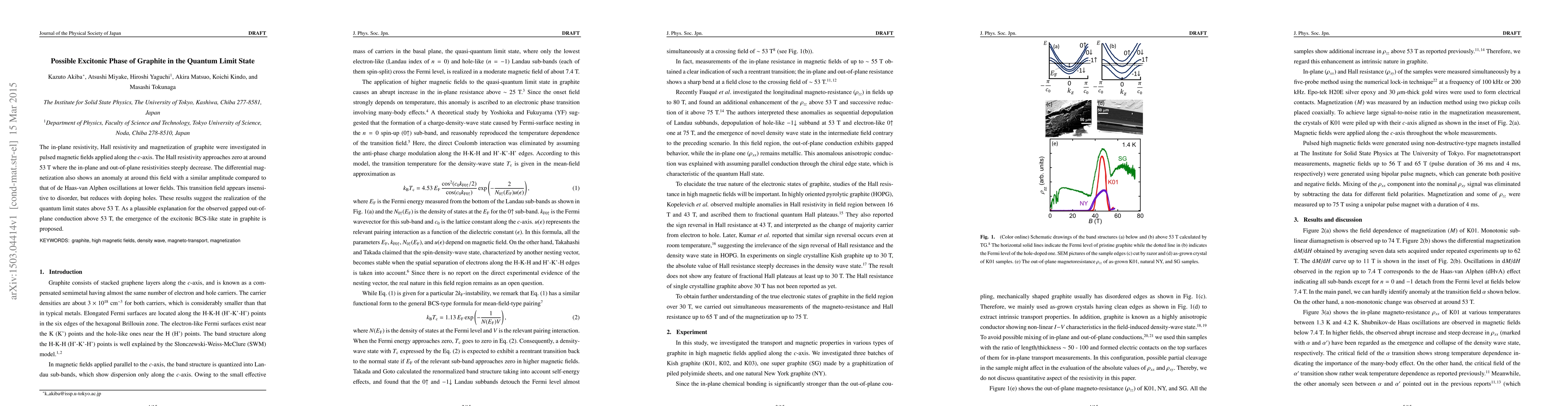 This study investigates graphite's electrical and magnetic properties under high pulsed magnetic fields, revealing a transition at around 53 T where resistivity and magnetization anomalies suggest a quantum limit state. The findings propose the possibility of an excitonic BCS-like phase in graphite above this field.