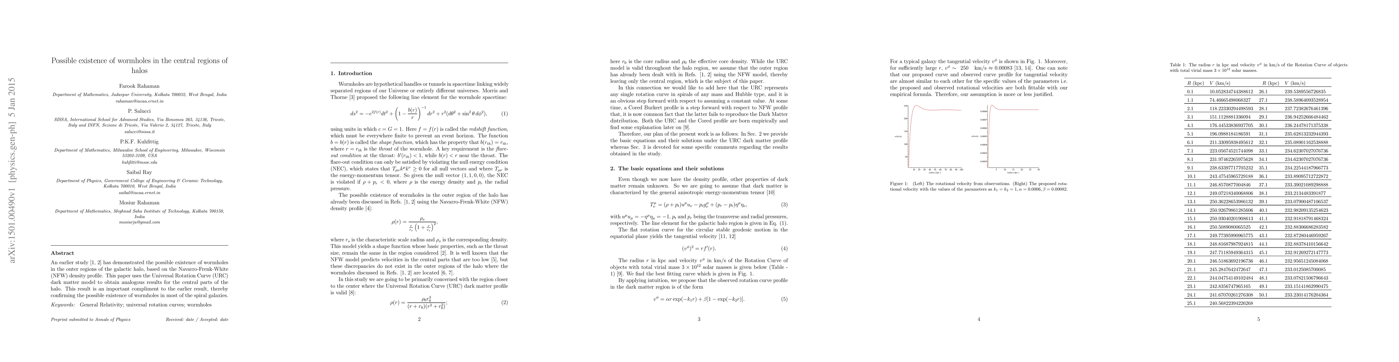 An earlier study [Rahaman et al. (2014) & Kuhfittig (2014)] has demonstrated the possible existence of wormholes in the outer regions of the galactic halo, based on the Navarro-Frenk-White (NFW) density profile. This paper uses the Universal Rotation Curve (URC) dark matter model to obtain analogous results for the central parts of the halo. This result is an important compliment to the earlier result, thereby confirming the possible existence of wormholes in most of the spiral galaxies.