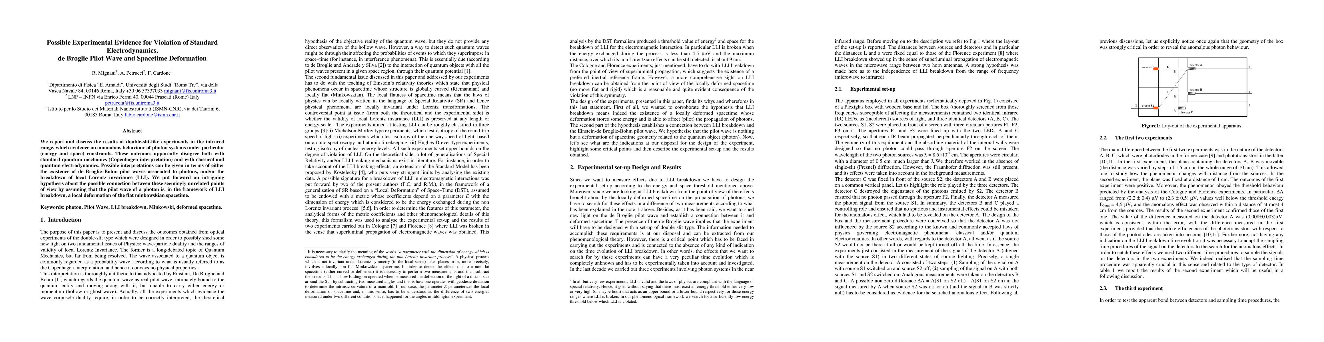 We report and discuss the results of double-slit-like experiments in the infrared range, which evidence an anomalous behaviour of photon systems under particular (energy and space) constraints. These outcomes apparently disagree both with standard quantum mechanics (Copenhagen interpretation) and with classical and quantum electrodynamics. Possible interpretations can be given in terms of either the existence of de Broglie-Bohm pilot waves associated to photons, and/or the breakdown of local Lorentz invariance (LLI). We put forward an intriguing hypothesis about the possible connection between these seemingly unrelated points of view by assuming that the pilot wave of a photon is, in the framework of LLI breakdown, a local deformation of the flat minkowskian spacetime.