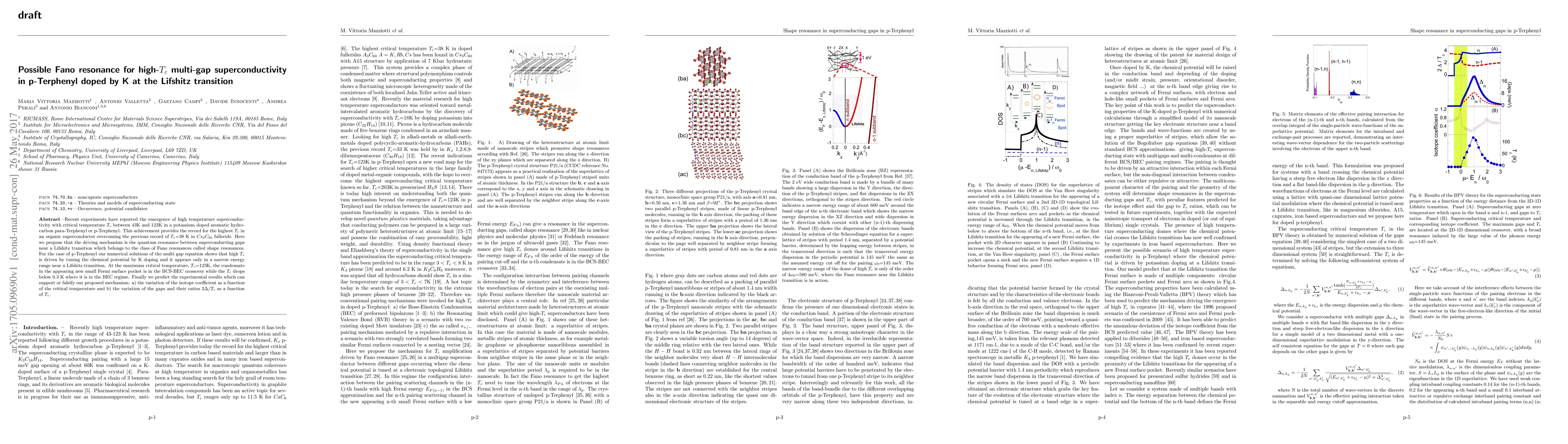 This paper investigates the high temperature superconductivity in potassium-doped p-Terphenyl, proposing that Fano resonances near a Lifshitz transition drive the superconductivity with a critical temperature of up to 123K. The study suggests that K doping tunes the chemical potential to achieve this high Tc, and predicts experimental tests to validate the proposed mechanism.