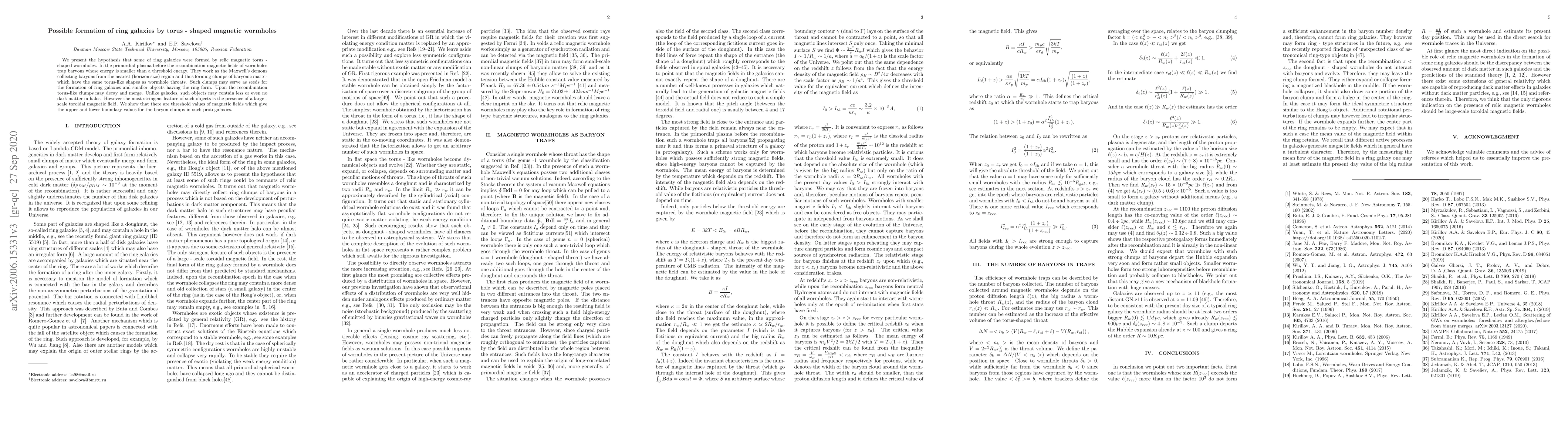 This paper hypothesizes that ring galaxies may form from torus-shaped magnetic wormholes in primordial plasma, where trapped baryons create torus-like clumps that evolve into ring galaxies. These objects may lack dark matter halos and possess large-scale toroidal magnetic fields.