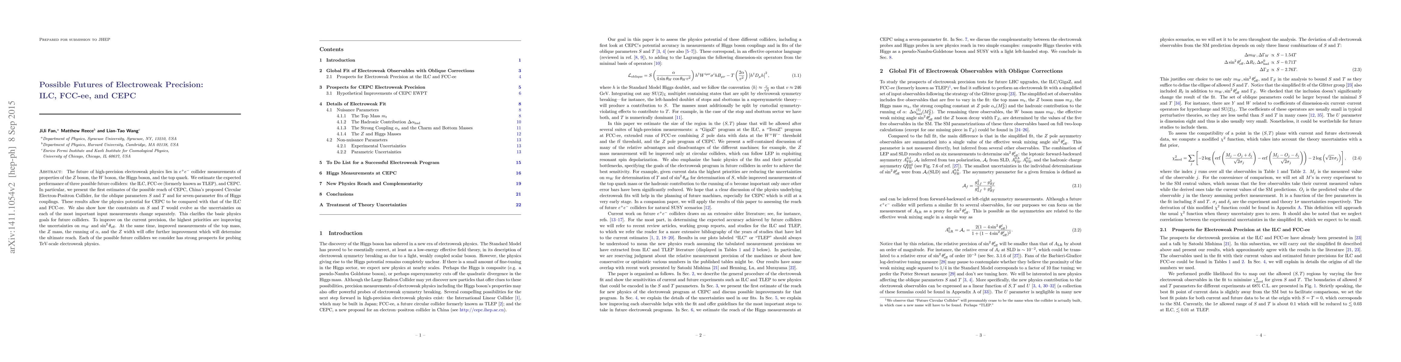 The future of high-precision electroweak physics lies in e+e- collider measurements of properties of the Z boson, the W boson, the Higgs boson, and the top quark. We estimate the expected performance of three possible future colliders: the ILC, FCC-ee (formerly known as TLEP), and CEPC. In particular, we present the first estimates of the possible reach of CEPC, China's proposed Circular Electron-Positron Collider, for the oblique parameters S and T and for seven-parameter fits of Higgs couplings. These results allow the physics potential for CEPC to be compared with that of the ILC and FCC-ee. We also show how the constraints on S and T would evolve as the uncertainties on each of the most important input measurements change separately. This clarifies the basic physics goals for future colliders. To improve on the current precision, the highest priorities are improving the uncertainties on the W mass and effective weak mixing angle. At the same time, improved measurements of the top mass, the Z mass, the running of alpha, and the Z width will offer further improvement which will determine the ultimate reach. Each of the possible future colliders we consider has strong prospects for probing TeV-scale electroweak physics.