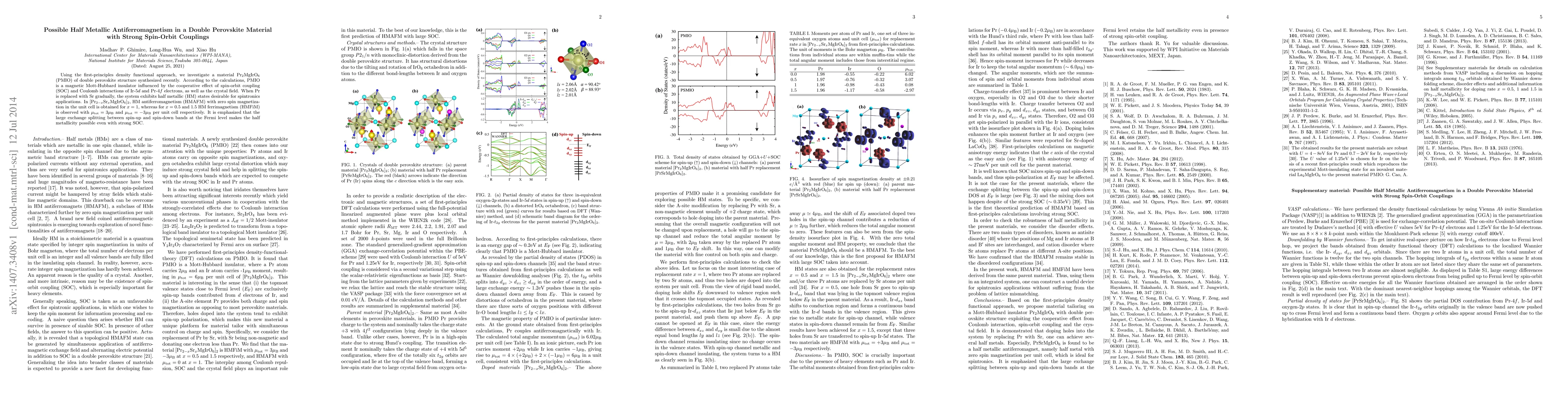 Using the first-principles density functional approach, we investigate a material Pr$_2$MgIrO$_6$ (PMIO) of double perovskite structure synthesized recently. According to the calculations, PMIO is a magnetic Mott-Hubbard insulator influenced by the cooperative effect of spin-orbit coupling (SOC) and Coulomb interactions of Ir-5$d$ and Pr-4$f$ electrons, as well as the crystal field. When Pr is replaced with Sr gradually, the system exhibits half metallic (HM) states desirable for spintronics applications. In [Pr$_{2-x}$Sr$_x$MgIrO$_6$]$_2$, HM antiferromagnetism (HMAFM) with zero spin magnetization in the unit cell is obtained for $x=1$, whereas for $x=0.5$ and 1.5 HM ferrimagnetism (HMFiM) is observed with $\mu_{\rm tot}=3\mu_{\rm B}$ and $\mu_{\rm tot}=-3\mu_{\rm B}$ per unit cell respectively. It is emphasized that the large exchange splitting between spin-up and spin-down bands at the Fermi level makes the half metallicity possible even with strong SOC.