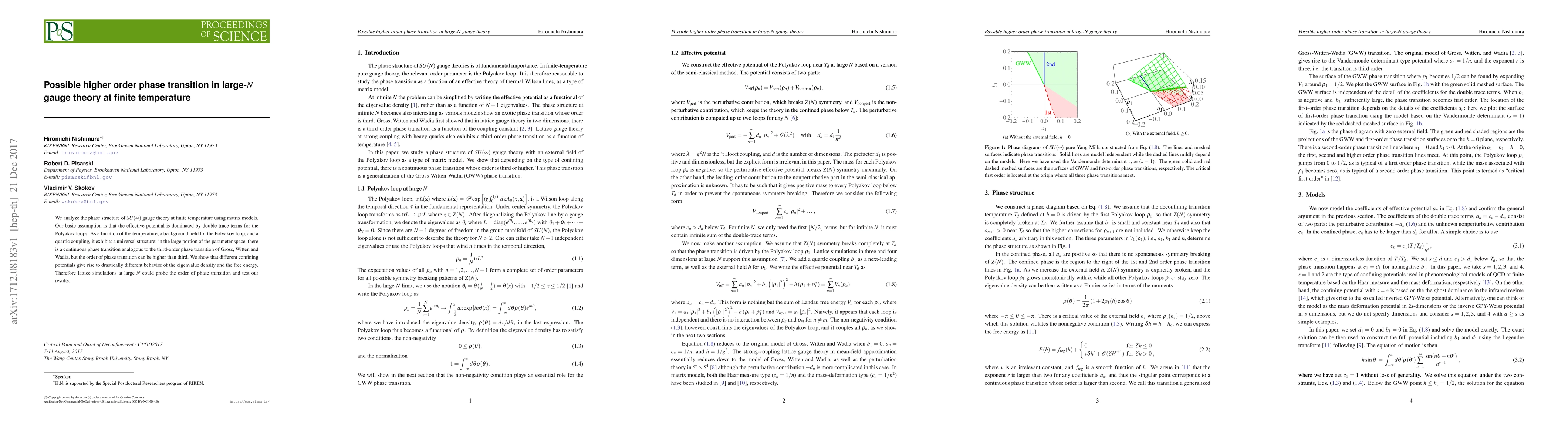 We analyze the phase structure of $SU(\infty)$ gauge theory at finite temperature using matrix models. Our basic assumption is that the effective potential is dominated by double-trace terms for the Polyakov loops. As a function of the temperature, a background field for the Polyakov loop, and a quartic coupling, it exhibits a universal structure: in the large portion of the parameter space, there is a continuous phase transition analogous to the third-order phase transition of Gross, Witten and Wadia, but the order of phase transition can be higher than third. We show that different confining potentials give rise to drastically different behavior of the eigenvalue density and the free energy. Therefore lattice simulations at large $N$ could probe the order of phase transition and test our results.