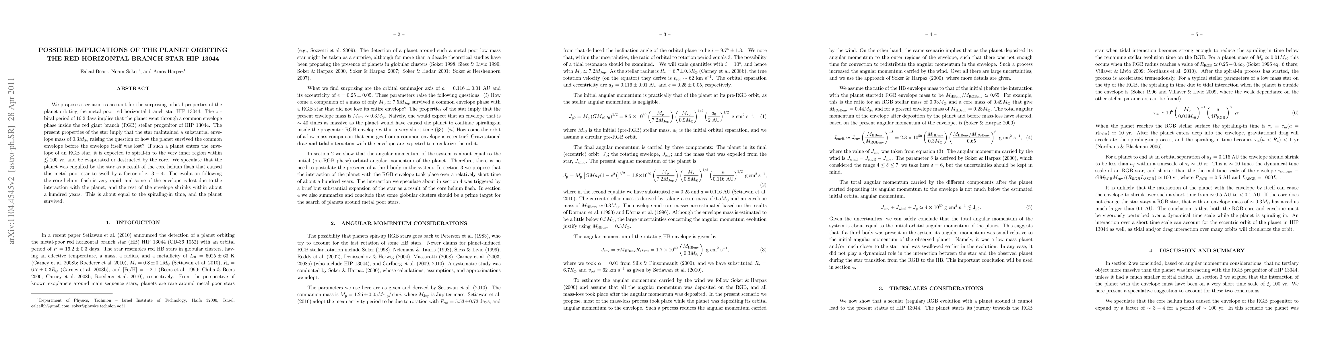 We propose a scenario to account for the surprising orbital properties of the planet orbiting the metal poor red horizontal branch star HIP 13044. The orbital period of 16.2 days implies that the planet went through a common envelope phase inside the red giant branch (RGB) stellar progenitor of HIP 13044. The present properties of the star imply that the star maintained a substantial envelope mass of 0.3Mo, raising the question of how the planet survived the common envelope before the envelope itself was lost? If such a planet enters the envelope of an RGB star, it is expected to spiral-in to the very inner region within <100yr, and be evaporated or destructed by the core. We speculate that the planet was engulfed by the star as a result of the core helium flash that caused this metal poor star to swell by a factor of ~3-4. The evolution following the core helium flash is very rapid, and some of the envelope is lost due to the interaction with the planet, and the rest of the envelope shrinks within about a hundred years. This is about equal to the spiraling-in time, and the planet survived.