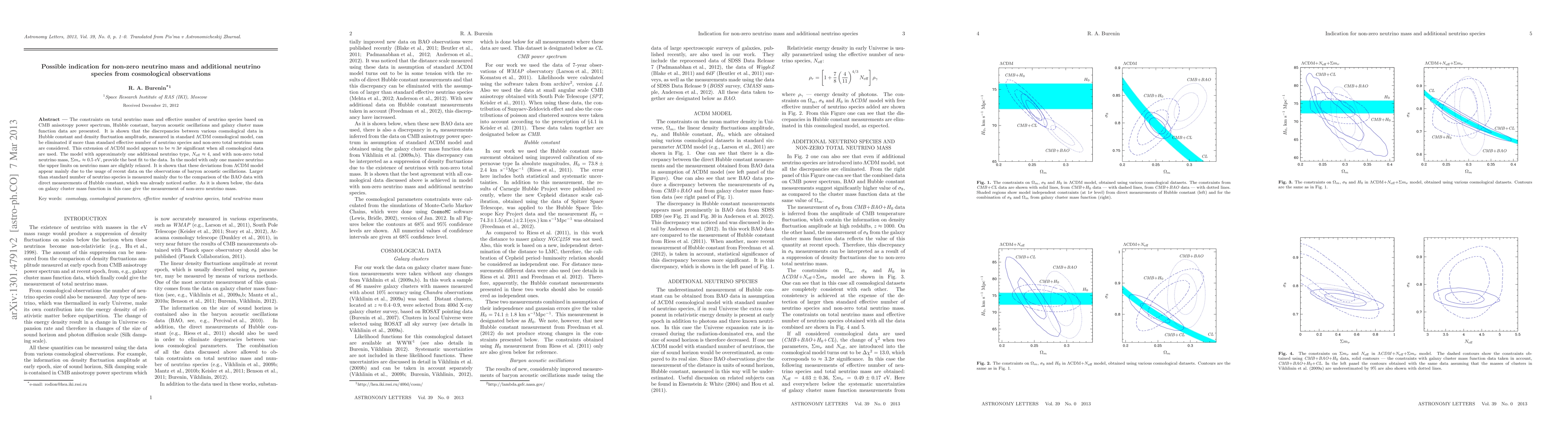 The constraints on total neutrino mass and effective number of neutrino species based on CMB anisotropy power spectrum, Hubble constant, baryon acoustic oscillations and galaxy cluster mass function data are presented. It is shown that the discrepancies between various cosmological data in Hubble constant and density fluctuation amplitude, measured in standard LCDM cosmological model, can be eliminated if more than standard effective number of neutrino species and non-zero total neutrino mass are considered. This extension of LCDM model appears to be \approx 3 \sigma\ significant when all cosmological data are used. The model with approximately one additional neutrino type, N_eff \approx 4, and with non-zero total neutrino mass, \approx 0.5 eV, provide the best fit to the data. In the model with only one massive neutrino the upper limits on neutrino mass are slightly relaxed. It is shown that these deviations from LCDM model appear mainly due to the usage of recent data on the observations of baryon acoustic oscillations. Larger than standard number of neutrino species is measured mainly due to the comparison of the BAO data with direct measurements of Hubble constant, which was already noticed earlier. As it is shown below, the data on galaxy cluster mass function in this case give the measurement of non-zero neutrino mass.
