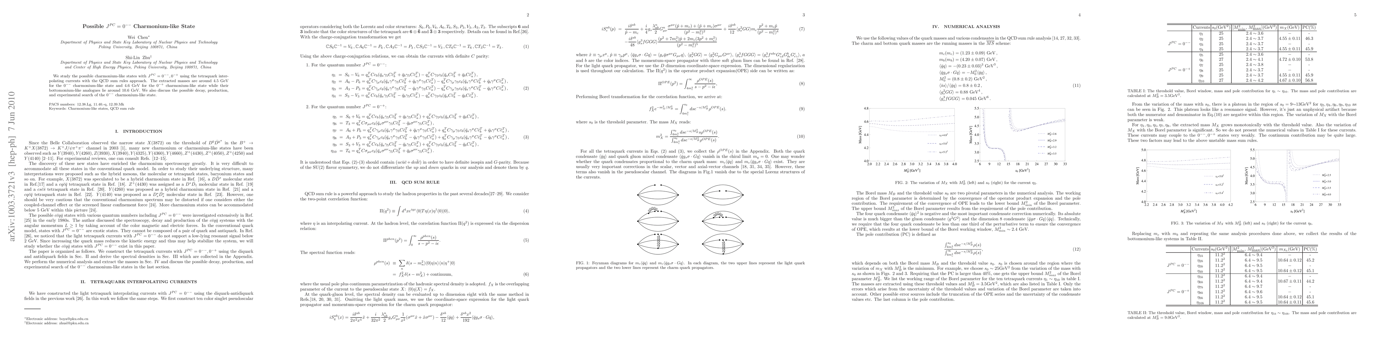 This study explores charmonium-like states with $J^{PC}=0^{--}$ and $0^{-+}$ using QCD sum rules, finding masses around 4.5 GeV for $0^{--}$ and 4.6 GeV for $0^{-+}$, significantly lower than their bottomonium counterparts. The paper also discusses potential decay and production mechanisms for the $0^{--}$ state.