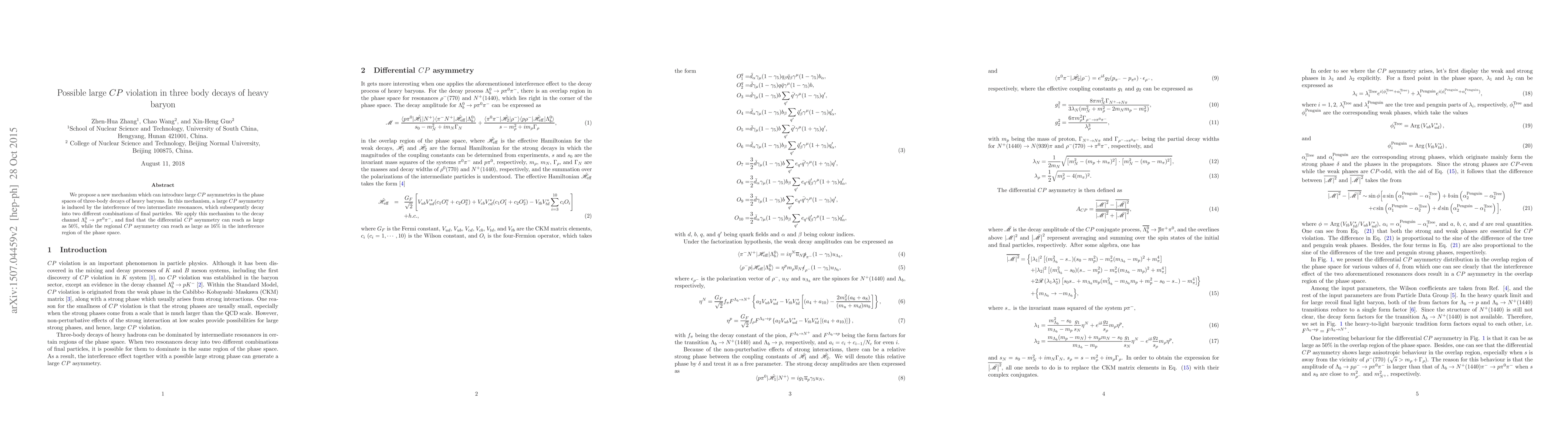 The research proposes a novel mechanism for generating substantial CP asymmetries in the three-body decay processes of heavy baryons, specifically the Λ_b^0 decaying into p, π^0, and π^-. This mechanism arises from the interference of two distinct intermediate resonances decaying into different final particle pairs, potentially leading to a 50% differential CP asymmetry and a 16% regional CP asymmetry within the interference phase space region.