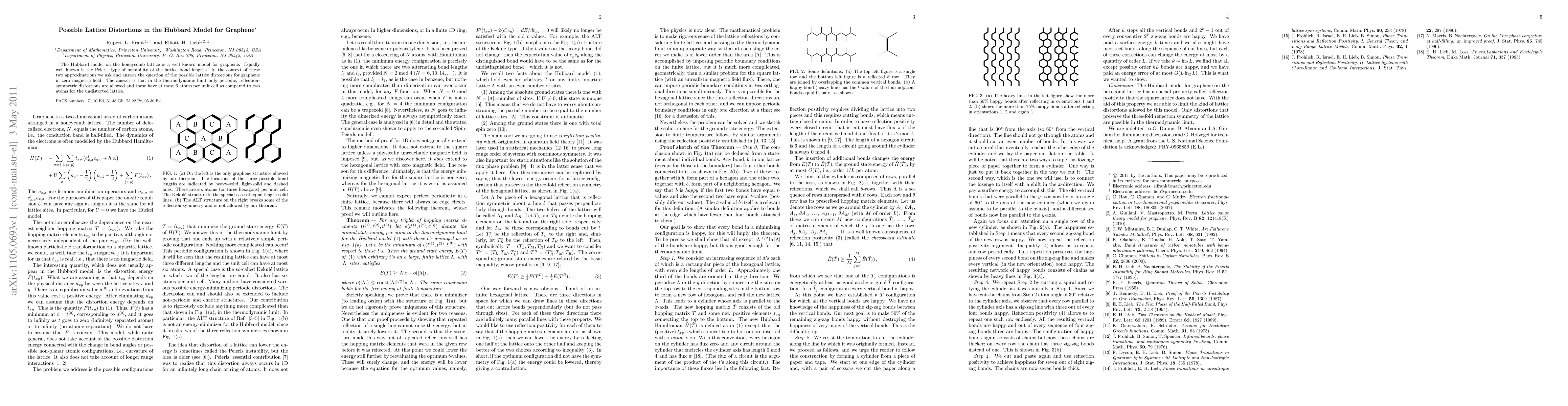 This paper investigates lattice distortions in the Hubbard model for graphene, finding that only periodic, reflection-symmetric distortions are permissible in the thermodynamic limit, with a maximum of six atoms per unit cell compared to the two atoms in the undistorted lattice.