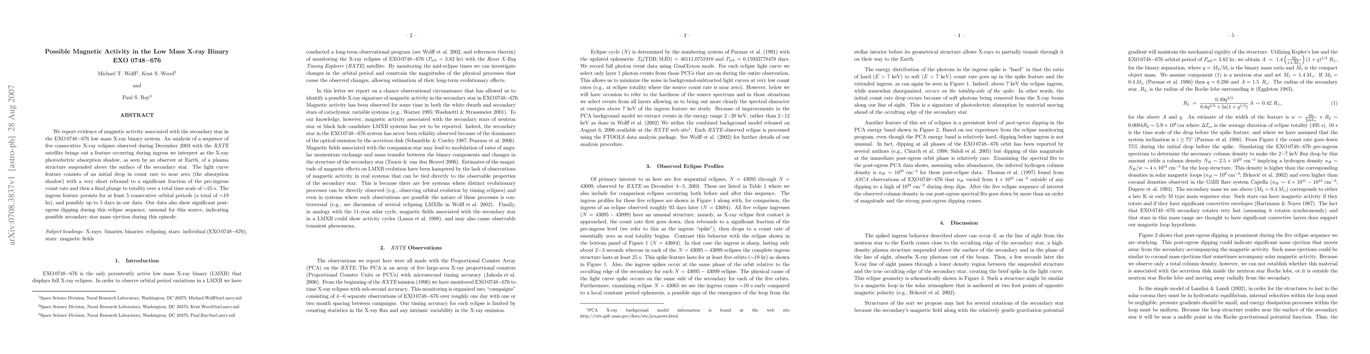 The study presents evidence of magnetic activity linked to the secondary star in the EXO 0748-676 X-ray binary system, detected through five consecutive X-ray eclipses using RXTE data. It reveals an absorption shadow feature during eclipse ingress, interpreted as a plasma structure above the secondary's surface, with possible mass ejection indicated by post-egress dipping.