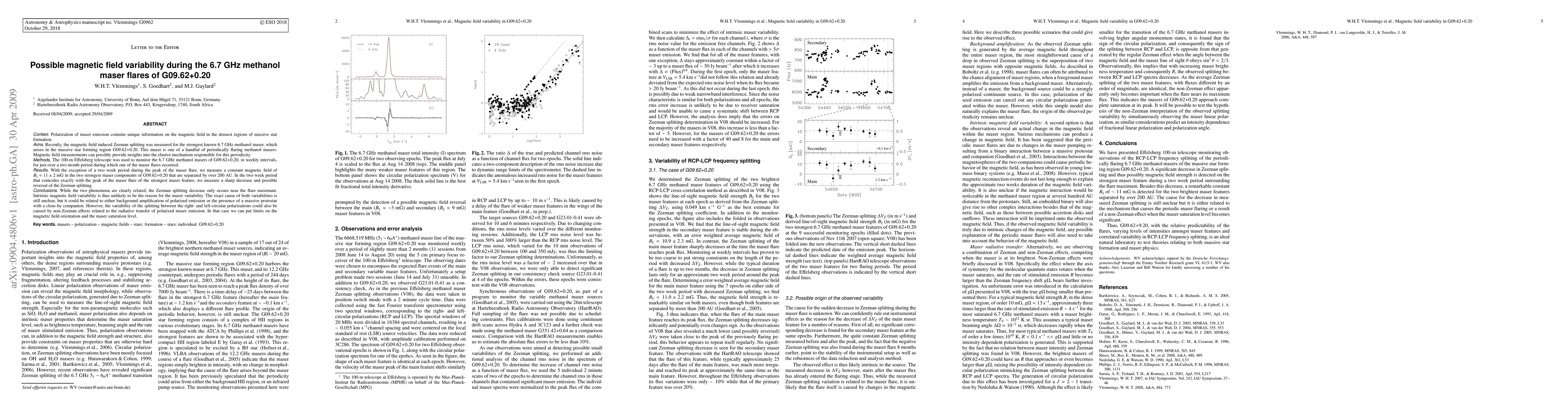 (Abridged) Recently, the magnetic field induced Zeeman splitting was measured for the strongest known 6.7 GHz methanol maser, which arises in the massive star forming region G09.62+0.20. This maser is one of a handful of periodically flaring methanol masers. The 100-m Effelsberg telescope was used to monitor the 6.7 GHz methanol masers of G09.62+0.20. With the exception of a two week period during the peak of the maser flare, we measure a constant magnetic field of B_||~11+-2 mG in the two strongest maser components of G09.62+0.20 that are separated by over 200 AU. In the two week period that coincides exactly with the peak of the maser flare of the strongest maser feature, we measure a sharp decrease and possible reversal of the Zeeman splitting. The exact cause of both maser and polarization variability is still unclear, but it could be related to either background amplification of polarized emission or the presence of a massive protostar with a close-by companion. Alternatively, the polarization variability could be caused by non-Zeeman effects related to the radiative transfer of polarized maser emission.