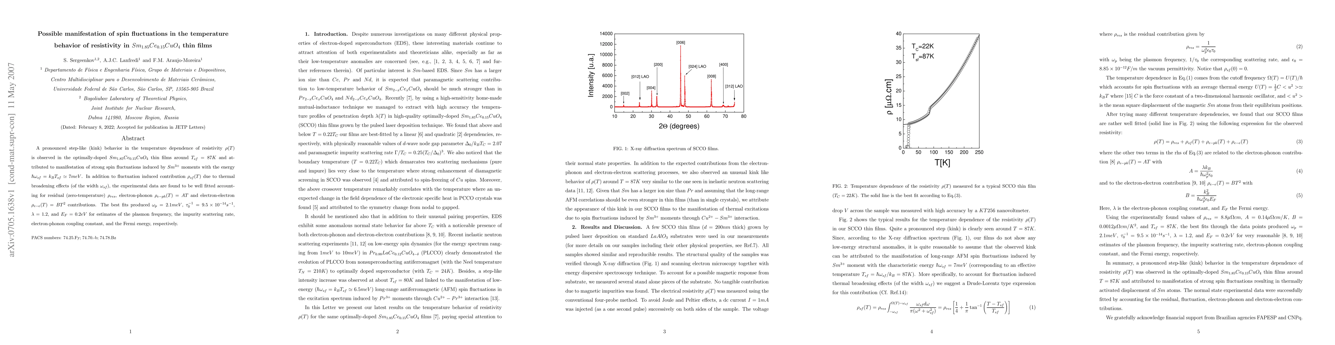 A pronounced step-like (kink) behavior in the temperature dependence of resistivity $\rho (T)$ is observed in the optimally-doped $Sm_{1.85}Ce_{0.15}CuO_4$ thin films around $T_{sf}=87K$ and attributed to manifestation of strong spin fluctuations induced by $Sm^{3+}$ moments with the energy $\hbar \omega_{sf}=k_BT_{sf}\simeq 7meV$. In addition to fluctuation induced contribution $\rho_{sf}(T)$ due to thermal broadening effects (of the width $\omega_{sf}$), the experimental data are found to be well fitted accounting for residual (zero-temperature) $\rho_{res}$, electron-phonon $\rho _{e-ph}(T)=AT$ and electron-electron $\rho_{e-e}(T)=BT^2$ contributions. The best fits produced $\omega_p=2.1meV$, $\tau_0^{-1}=9.5\times 10^{-14}s^{-1}$, $\lambda =1.2$, and $E_F=0.2eV$ for estimates of the plasmon frequency, the impurity scattering rate, electron-phonon coupling constant, and the Fermi energy, respectively.
