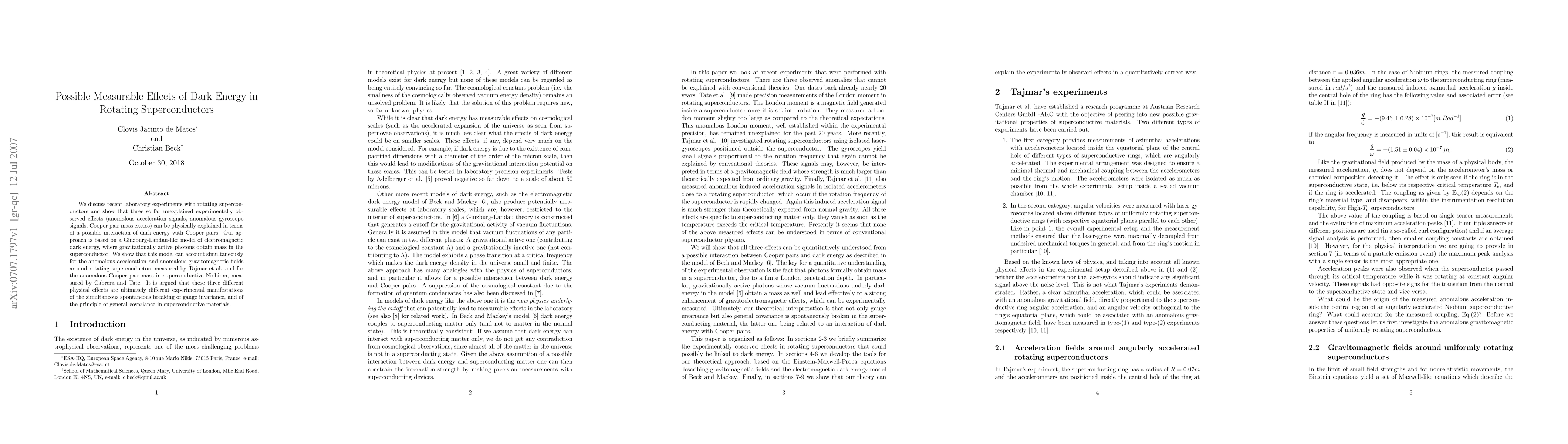 This paper explores the interaction of dark energy with Cooper pairs in rotating superconductors, explaining three unexplained experimental effects: anomalous acceleration, anomalous gyroscope signals, and Cooper pair mass excess. The proposed Ginzburg-Landau-like model suggests that gravitationally active photons gain mass in superconductors, linking these phenomena to the breaking of gauge invariance and general covariance.