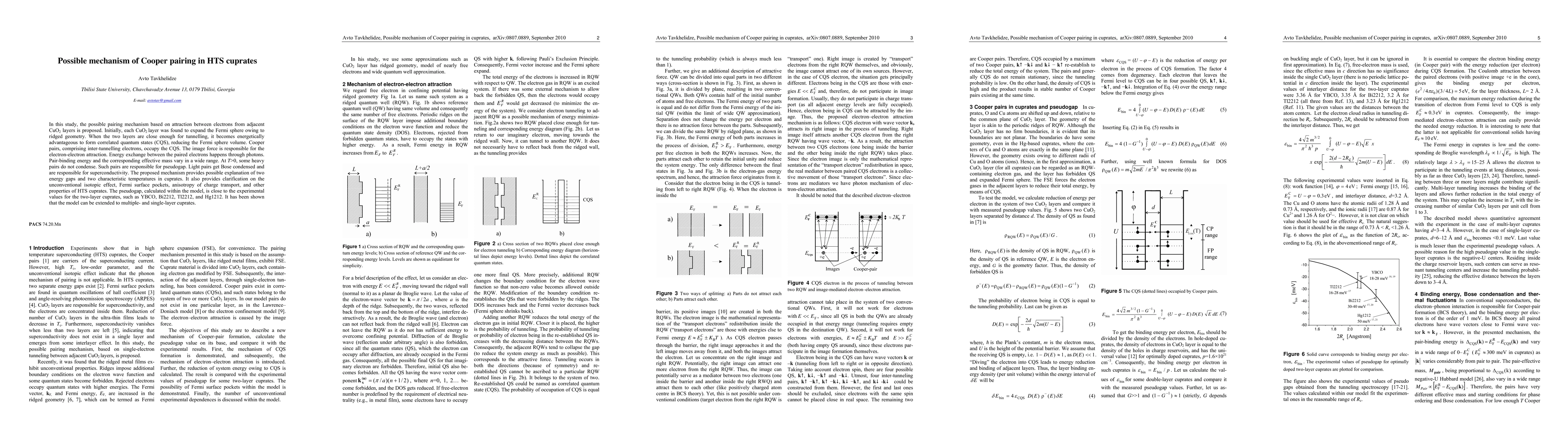 This study proposes a mechanism for Cooper pairing in high-temperature superconductors (HTS) based on electron attraction between adjacent CuO2 layers, suggesting that correlated quantum states formed via tunneling reduce the Fermi sphere volume. The model explains two energy gaps, pseudogap, and superconductivity, and aligns with experimental observations in various HTS cuprates.