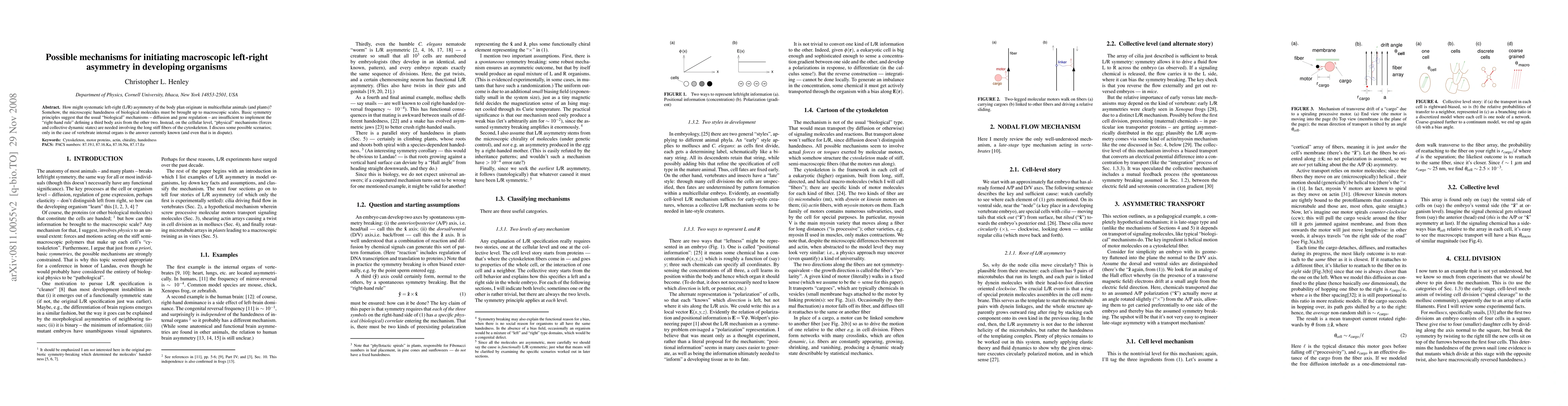 How might systematic left-right (L/R) asymmetry of the body plan originate in multicellular animals (and plants)? Somehow, the microscopic handedness of biological molecules must be brought up to macroscopic scales. Basic symmetry principles suggest that the usual "biological" mechanisms -- diffusion and gene regulation -- are insufficient to implement the "right-hand rule" defining a third body axis from the other two. Instead, on the cellular level, "physical" mechanisms (forces and collective dynamic states) are needed involving the long stiff fibers of the cytoskeleton. I discuss some possible scenarios; only in the case of vertebrate internal organs is the answer currently known (and even that is in dispute).