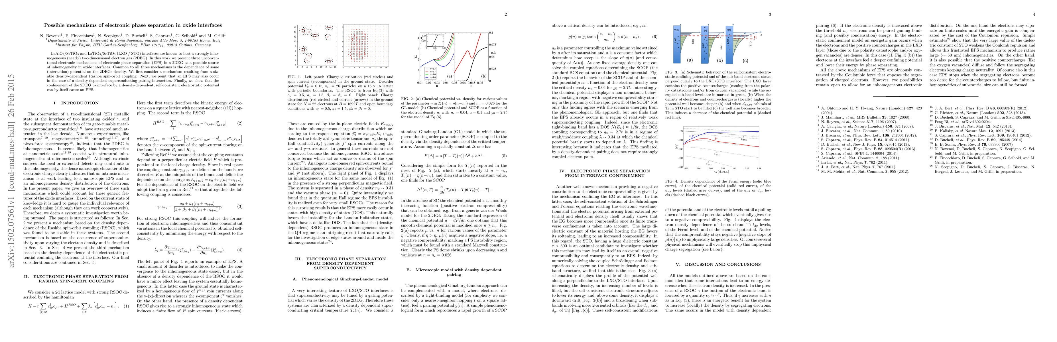 This paper explores three unconventional mechanisms of electronic phase separation in oxide interfaces, including density-dependent Rashba spin-orbit coupling, density-dependent superconducting pairing interaction, and confinement-induced electrostatic potential effects, all contributing to inhomogeneity in the electron gas.