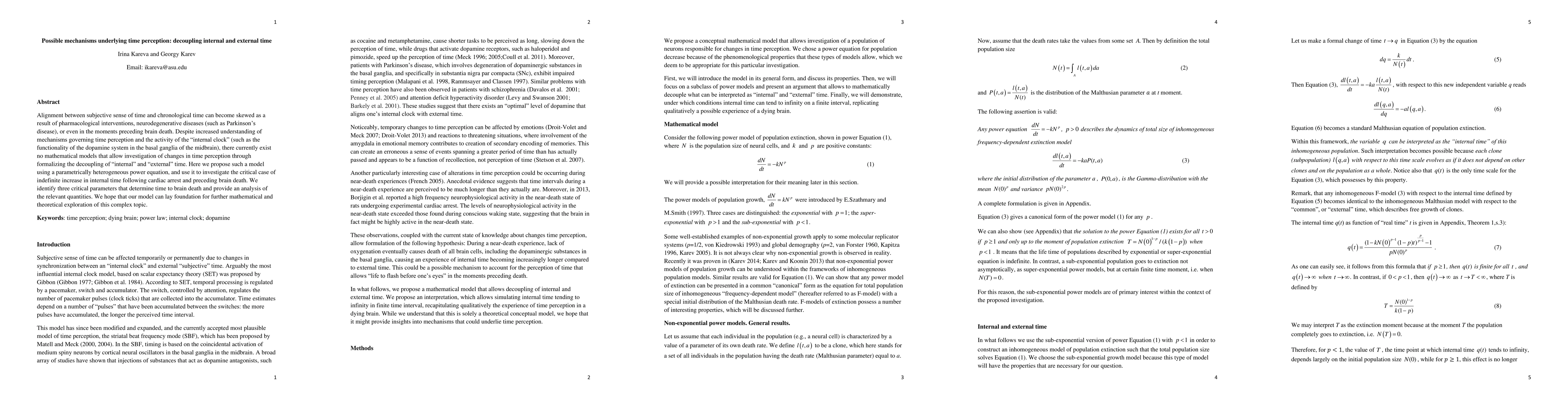 The paper proposes a mathematical model using a parametrically heterogeneous power equation to investigate the decoupling of 'internal' and 'external' time in time perception, focusing on the case of indefinite increase in internal time following cardiac arrest and preceding brain death.
