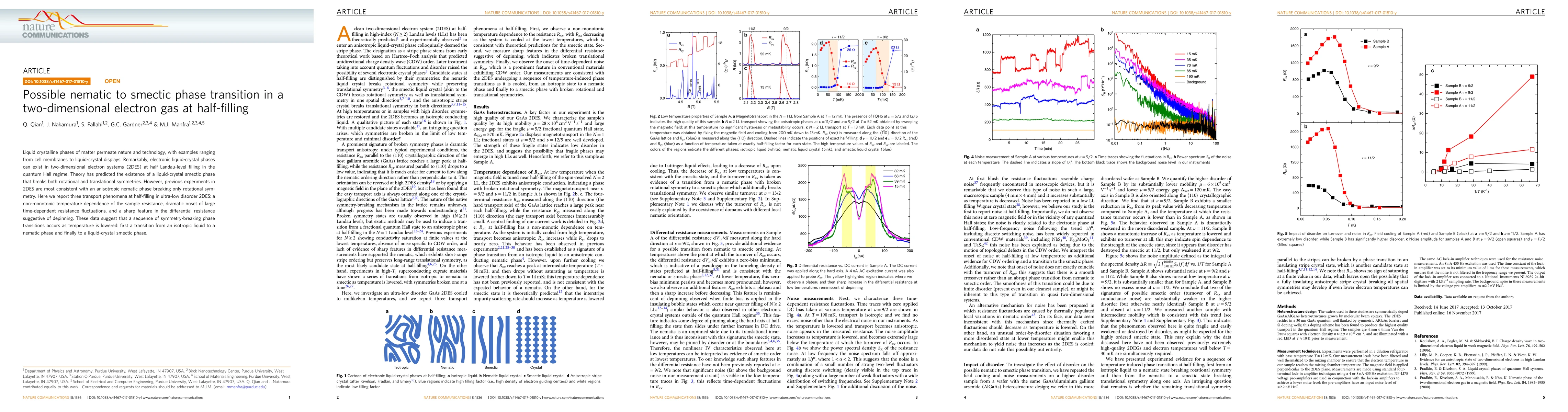 This paper investigates transport phenomena in a two-dimensional electron gas at half-filling, suggesting a transition from an isotropic liquid to a nematic phase and finally to a smectic phase, based on observed temperature-dependent resistance changes and fluctuations. The findings support theoretical predictions of a liquid crystal smectic phase in quantum Hall systems.