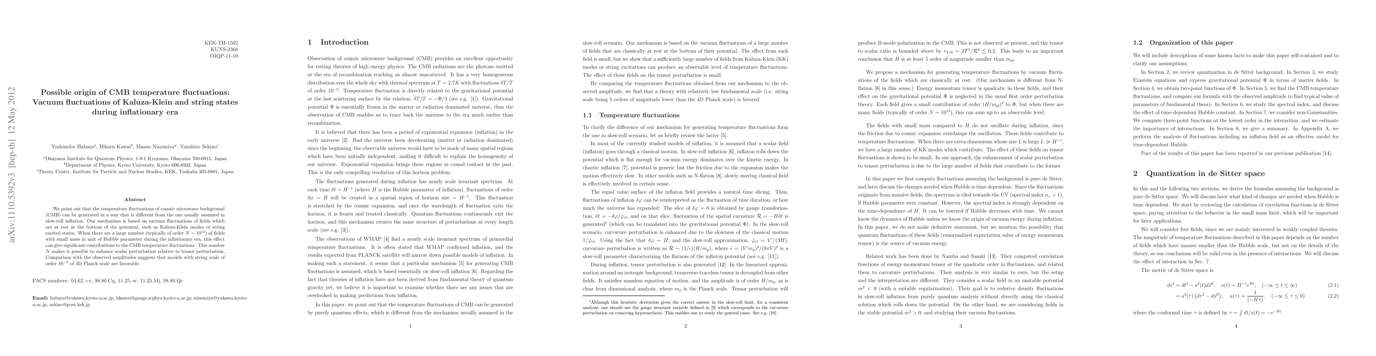 We point out that the temperature fluctuations of cosmic microwave background (CMB) can be generated in a way that is different from the one usually assumed in slow-roll inflation. Our mechanism is based on vacuum fluctuations of fields which are at rest at the bottom of the potential, such as Kaluza-Klein modes or string excited states. When there are a large number (typically of order $N\sim 10^{14}$) of fields with small mass in unit of Hubble parameter during the inflationary era, this effect can give significant contributions to the CMB temperature fluctuations. This number $N$ makes it possible to enhance scalar perturbation relative to tensor perturbation. Comparison with the observed amplitudes suggests that models with string scale of order $10^{-5}$ of 4D Planck scale are favorable.