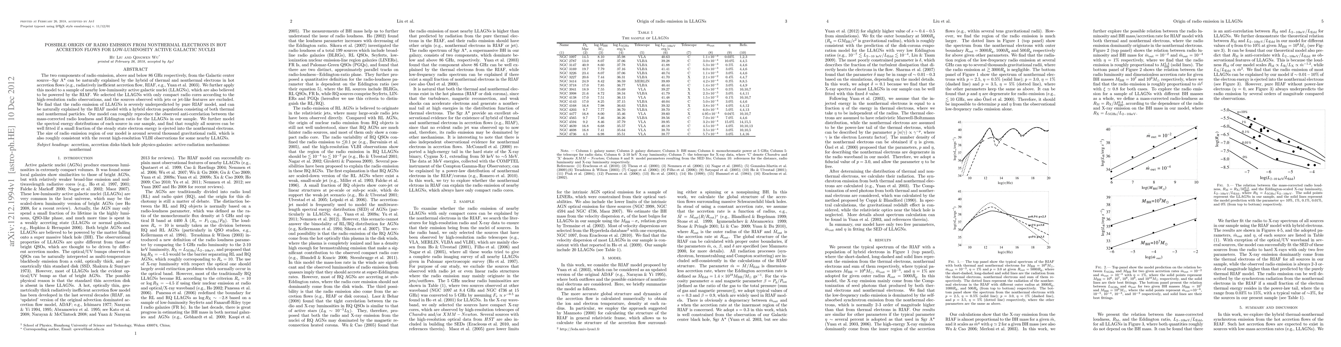 This paper proposes a hybrid model of thermal and nonthermal electrons in hot accretion flows to explain the radio emission in low-luminosity active galactic nuclei (LLAGNs), finding that the model can reproduce observed radio properties and spectral energy distributions. The model also aligns with recent high-resolution observations of the radio emission region size.
